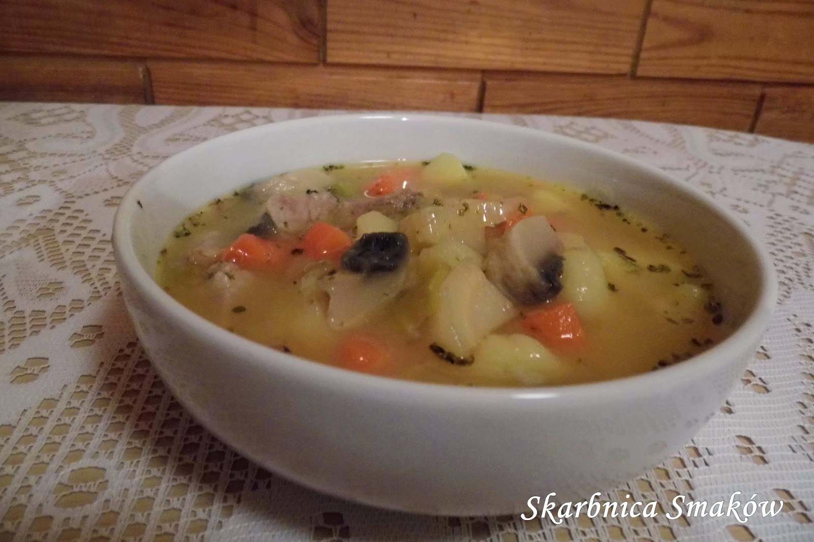 Masę warzywną dolać do gotującej się zupy, dobrze wszystko wymieszać, aby zupa uzyskała jednolitą konsystencję. Doprawić ją do smaku solą, pieprzem i majerankiem (oraz kminkiem, jeśli ktoś lubi).
