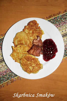 Raggmunkar podawać z boczkiem i dżemem z borówek.