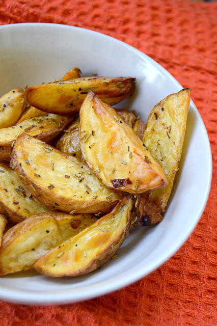 Ziemniaki dokładnie myjemy, pozostawiając skórkę . Kroimy na półksiężyce. Wykładamy na blasze wyłożonej papierem do pieczenia , skrapiamy lekko oliwą, doprawiamy rozmarynem , solą oraz pieprzem. Całość pieczemy do miękkości ( należy sprawdzać widelcem) , u mnie trwało to ok. 35 minut w piekarniku nagrzanym do 180 stopni.