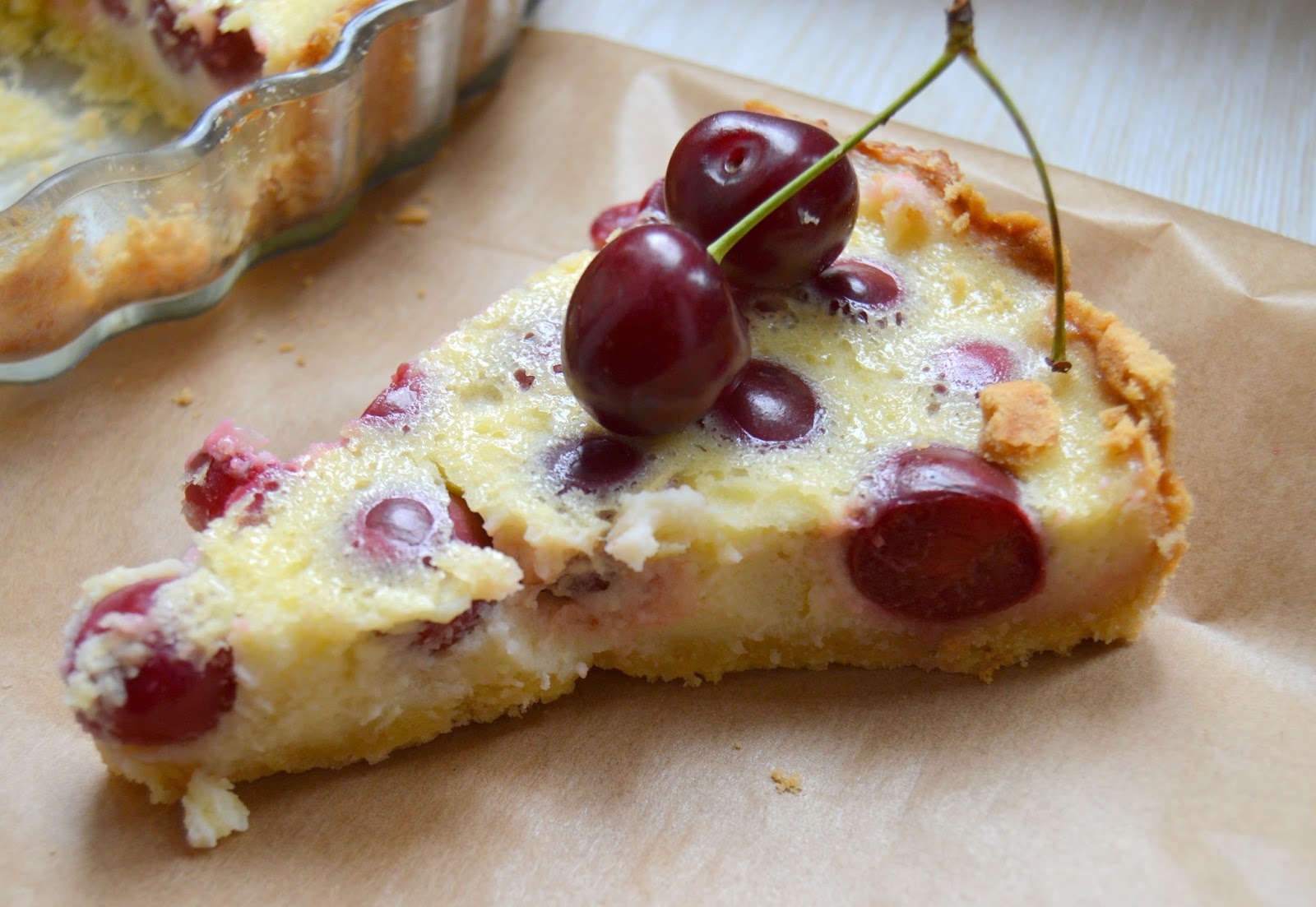 Jogurt, jajka, nasionka wanilii, sok i skórkę z cytryny, miód i mąkę ziemniaczaną krótko zblendować, tylko tyle, aby całość się połączyła i nie było w niej grudek. Jeśli zależy Wam na gładkiej tafli odczekajcie kilka minut aż pianka opadnie, jeśli macie to w nosie po prostu kilkakrotnie popukajcie naczyniem o blat stołu i wylejcie masę na podpieczony kruchy spód z czereśniami i posypcie to migdałami.