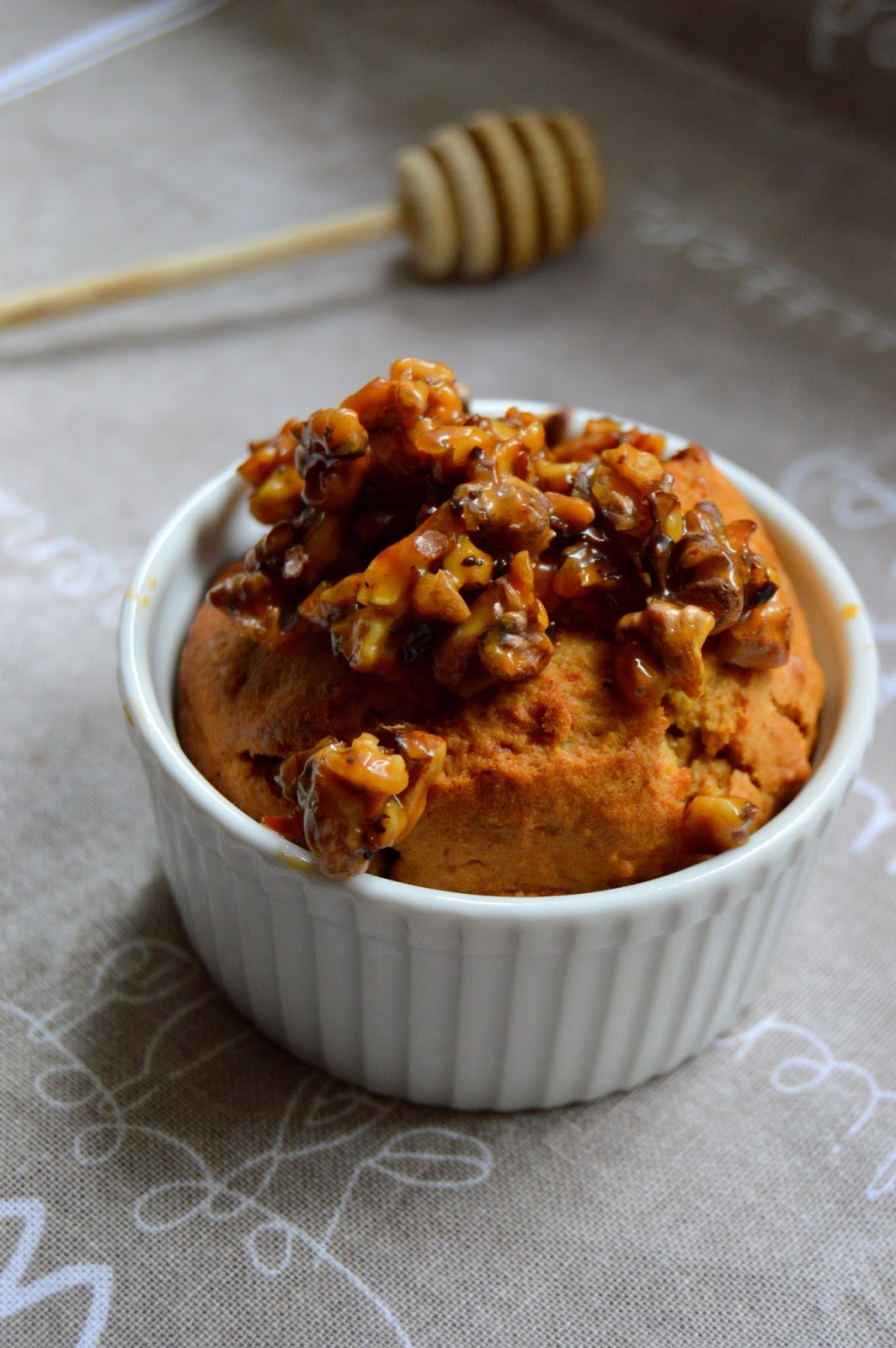 Orzechy lekko prażymy na patelni ,dodajemy ciepły karmel i całością dekorujemy muffiny .