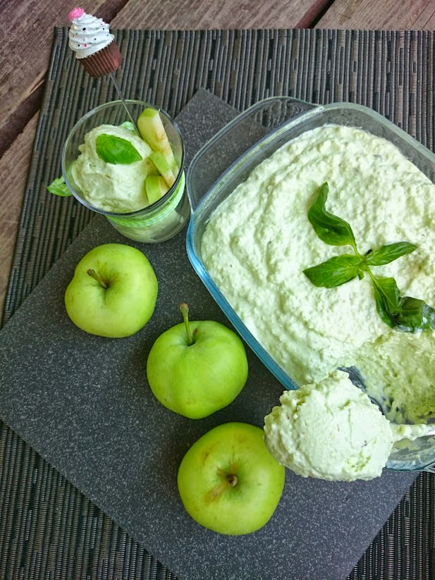 No ale wróćmy do lodów. Wykonane za pomocą\maszynki do lodów, która w sezonie letnim siedzi w zamrażalce non stop ;-) Lody mają mocno jabłkowy smak przełamany odrobiną bazylii. Nie są zbyt słodkie, ale ilość cukru to kwestia gustu. Niestety jak dla mnie są\zbyt tłuste, dlatego już myślę o ich lżejszej sorbetowej wersji.