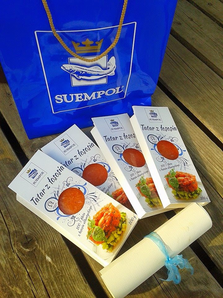 Zostałam ostatnio poproszona o przetestowanie i wyrażenie opinie o tatarze z łososia firmy Suempol.Jako, że ryby ( a w szczególności łosoś , tuńczyk i śledź ) wygrywają u mnie w kuchni z mięsem zgodziłam się bez wąchania. Po kilku dniach wymiany korespondencji z Panią Ania kurier dostarczył mi przesyłkę zawierającą 5 opakowań z Panem łososiem.