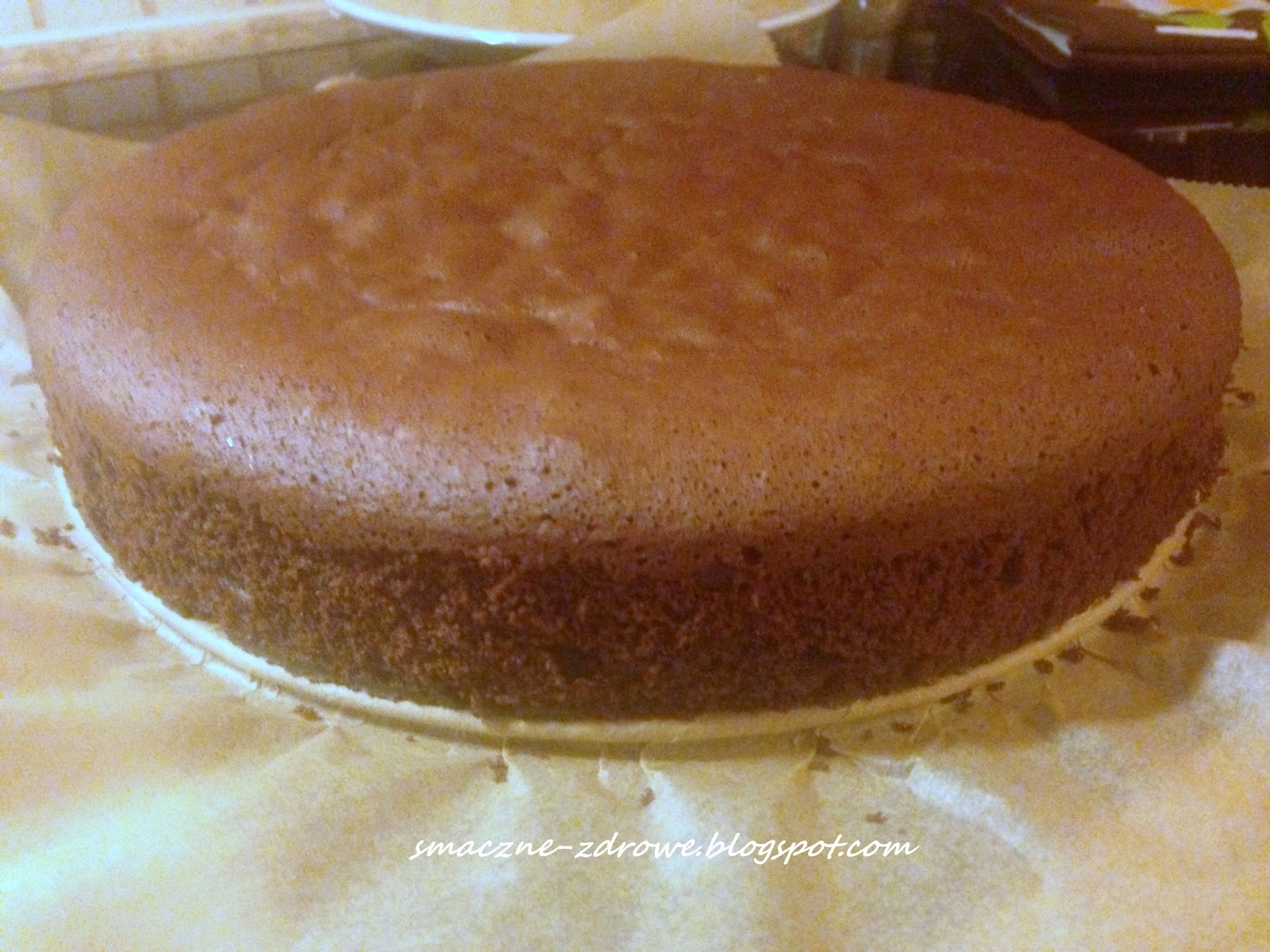 i ubić masę na sztywno. Dodajemy po jednym żółtku i cały czas ubijamy. Na końcu dodajemy mąkę wymieszaną z kakao i dokładnie, delikatnie mieszamy do połączenia składników. Gotową masę wylewamy do przygotowanej wcześniej tortownicy (spód wyłożony papierem do pieczenia, boki nie posmarowane), wyrównujemy i