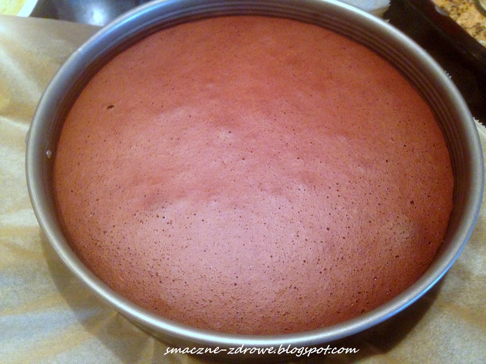 Gotową masę wylewamy do przygotowanej wcześniej tortownicy (boków nie smarować, spód wyłożony papierem do pieczenia), wyrównujemy i