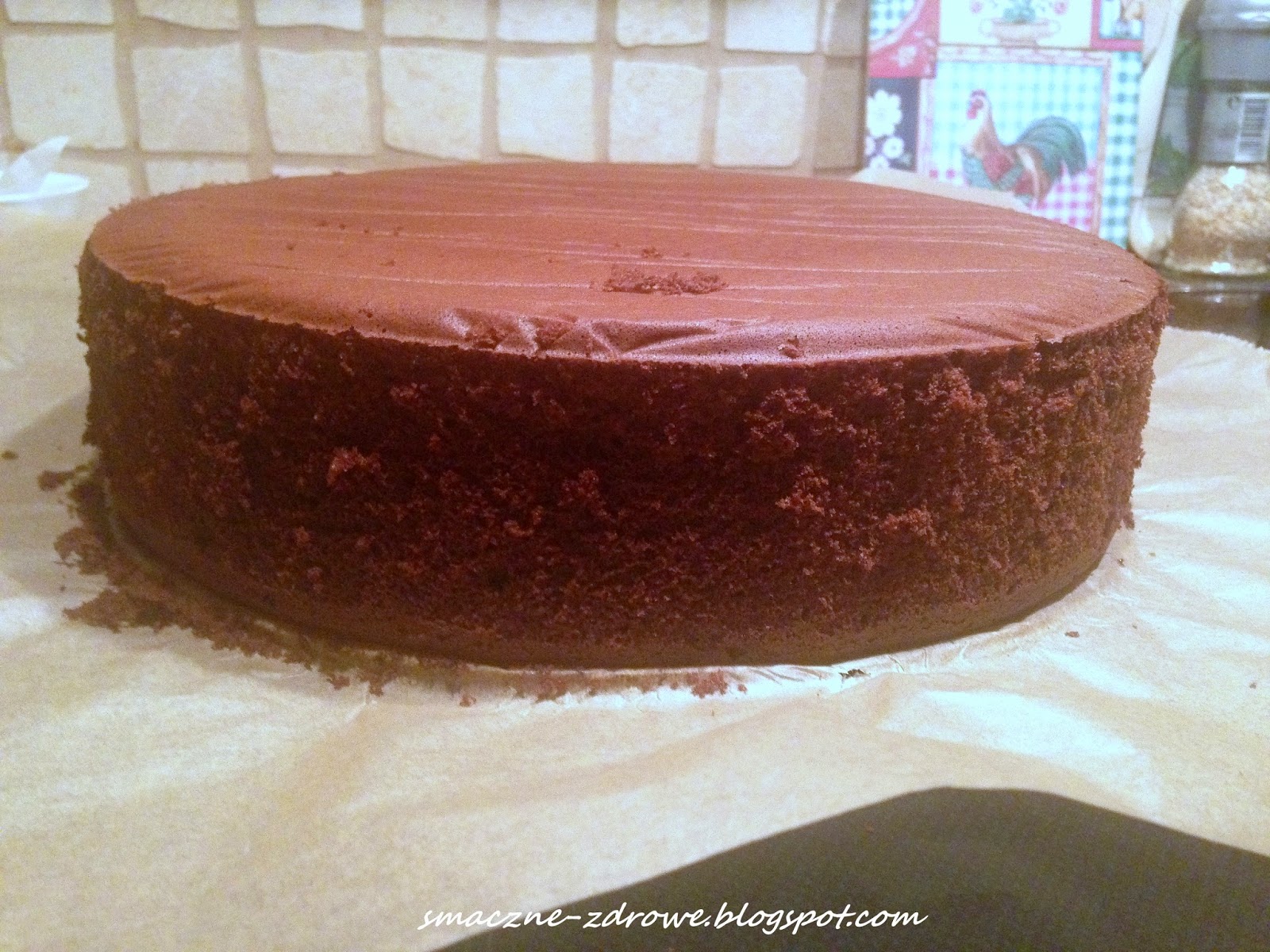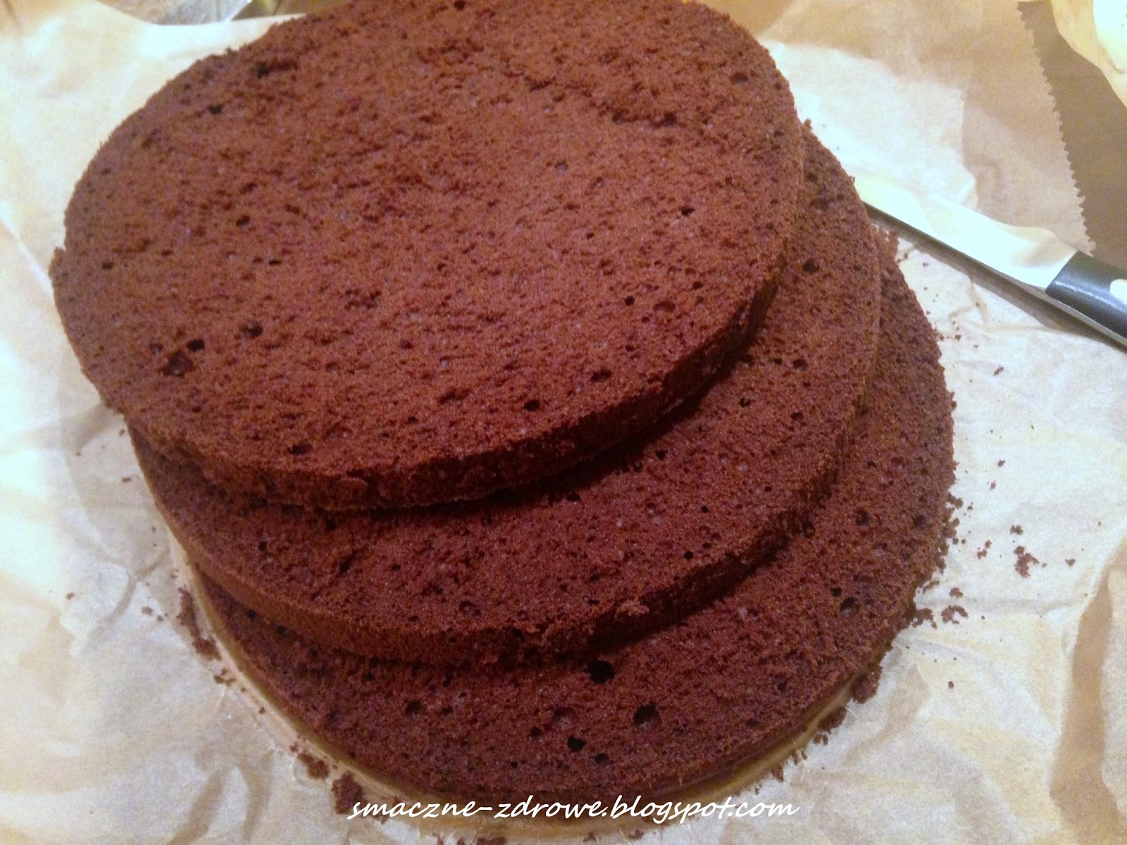 Biszkopt czekoladowy na mące orkiszowej bez dodatku cukru i proszku do pieczenia. Zawsze przygotowuję biszkopty jasne według zasady: na każde jajko łyżka ksylitolu (lub cukru) i łyżka mąki kiedyś pszennej-tortowej, teraz orkiszowej. Ponieważ mąka orkiszowa inaczej zagęszcza ciasto niż pszenna, staram się jej dawać trochę więcej, by uzyskać zbliżoną konsystencję ciasta. Przy biszkopcie ciemnym zasada ta troszkę się zmienia. Nigdy nie dodaję do moich biszkoptów proszku do pieczenia a zawsze pięknie wyrastają. Białka należy mocno ubić, dopiero wówczas dodajemy ksylitol (lub cukier) i później pojedynczo żółtka. Na końcu dodajemy mąkę (lub mąkę z kakao przy biszkopcie czekoladowym) i delikatnie mieszamy całość do połączenia składników. Przepis podaję na dwa biszkopty: jeden niższy, z którego po przekrojeniu uzyskamy dwa blaty i wyższy na trzy blaty. Podaję także ilości w gramach (tak dla orientacji), są to ilości jakie ja dawałam. Tu nie chodzi o aptekarską dokładność, co do grama, bo ilości mąki i ksylitolu wcale nie były proporcjonalne a obydwa biszkopty wyszły idealne. Tak po prostu odmierzyłam i tak dałam. Te biszkopty nigdy nie są suche, choć oczywiście możemy je nasączać (przygotowując tort) gdy chcemy, ale nie jest to konieczne.