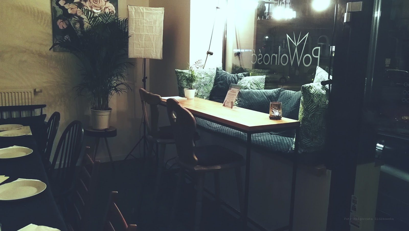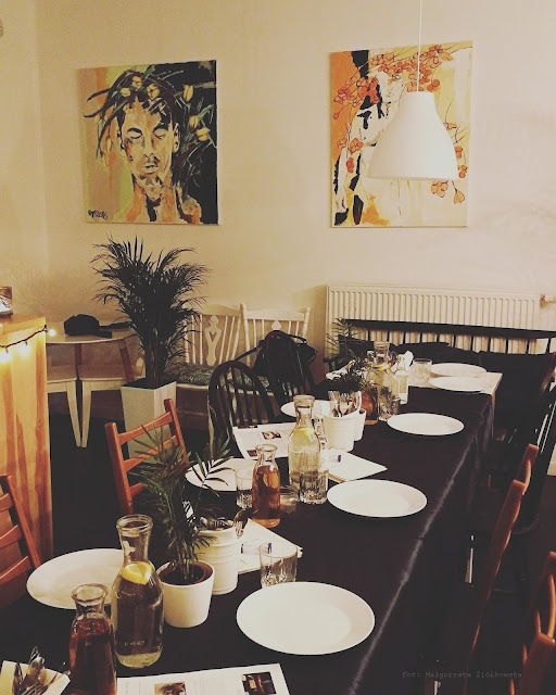 Kuchnia Poznań i wziąć dzięki temu udział w fantastycznej kolacji degustacyjnej nowego menu w nowym i przede wszystkim moim kochanym miejscu z dzieciństwa jakim jest Łazarz na którym się zresztą wychowałam. Lokal malutki, usytuowany na ulicy Kanałowej 15, zaprojektowany w dobrym klimacie, zieleni przyjaznej dla oka z ręcznie wykonanymi malowidłami tworzącymi ścienną designerską wystawę autorskich dzieł sztuki, które będzie można sobie upatrzyć, poprosić o zapakowanie, zapłacić i zabrać z sobą do domu! Ale o to można dopytać też na miejscu bardzo sympatyczny Team który wprowadzi nie tylko w tajniki malowideł ale odda w Wasze ręce swobodę panującą w lokalu i być może wesprze Was, Wasze rodziny, związki w budowanie relacji poprzez Jupitajnię Friends, która ma na celu przede wszystkim odciągać nas od ciągłego buszowania w telefonach. Jupitajnia to taka wymyślona, również autorska gra stworzona przez Magdę, właścicielkę lokalu by zachęcić do dyskusji choćby poprzez odpowiadanie na zadane w grze pytania. Można całkiem fajnie powolnie spędzić tam czas! Kim są właściciele? Tak naprawdę nie do końca wiem, tylko tyle, że Magda jest narzeczoną fotografa i przyjaciółką Waldka a On sam jest szefem kuchni i dla całej tej sprawy porzucił korporacje by zakasać rękawy i pokazać na co go stać! Miło się siedziało i choć byłam jedyną osobą chyba która nie znała pozostałych, taką wiecie szarą myszą wplątana w towarzystwo gastro znawców to jakoś ten czas został powolnie rozluźniony, między innymi przez pytania z gry, że chyba trochę się zasiedzieliśmy.