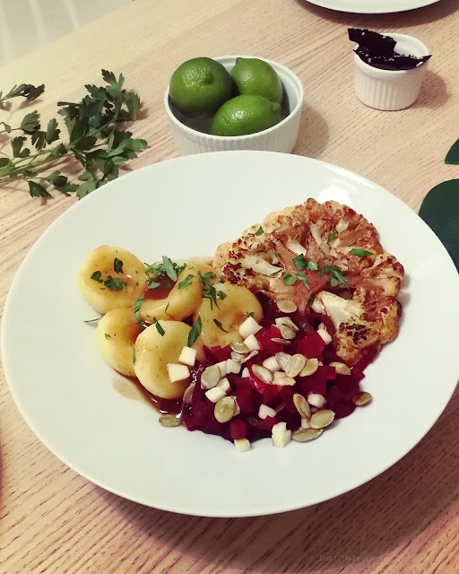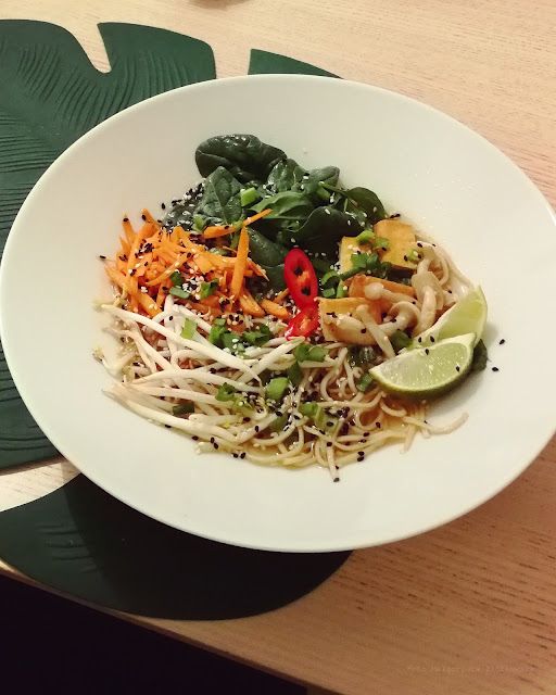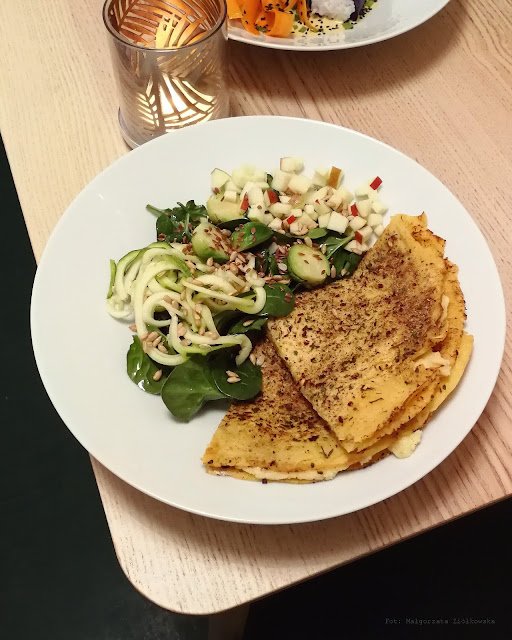 Kuchnia Powolność miejsce stosunkowo nowe, działające od blisko trzech miesięcy, serwujące kuchnie wegańską i co bardzo miłe zjedzą tutaj również bezglutenowcy. Myślę, że świetnie odnajdą się tutaj też mięsożercy wgryzając się w kalafiorowego steka jak u mamy z pysznymi delikatnymi śląskimi kluchami wypełniającymi talerz i pieczeniowym sosem, który zresztą okazuję się tutaj hiciorem numer jeden! Kuchnia Powolność zdecydowanie zaskakuje! W nowej karcie znalazło się miejsce na esencjonalny Ramen z tofu, za którym osobiście nie przepadam i nawet nie bardzo potrafię się za niego zabrać więc wyjadłam tylko tofu :-) ale zwolennicy tego obecnie modnego ramenowego kultu z pewnością zaspokoją swoje kubki smakowe. Pojawia się również rolka kokosowego ryżu zawinięta w czerwoną kapustę, obok panierowane na ostro tofu a wszystko skąpane w aromatycznym sosie z dodatkiem rokitnika, naleśnik z farszem ziemniaczano migdałowym pachnącym czosnkiem w towarzystwie salsy jabłkowej, cukinii i aromatycznej limonki, a na koniec tofurnik matcha na spodzie z grubo siekanych orzechów, który nie przypomina ani przez chwilę plastikowego sernika, jest kremowy, delikatny, lekko kwaskowy z nutą kokosa i matcha, przede wszystkim nie wyczuwam nadmiernej jej goryczy a po każdym kęsie myślę sobie, że nas nabierają bo czy tofurnik może być aż tak dobry? a jednak! Zdecydowanie rzadko piszę publikacje z odwiedzin w nowych czy też dłużej funkcjonujących miejsc, to jest jednak miejsce warte polecenia. Każdy przecież kochający kuchnię wegańską doskonale wie ile serca trzeba włożyć w smak tej kuchni by zaskoczyć innych, kuchnia niby roślinna, prosta a jednak trudna i by przekonać innych do jej skosztowania trzeba umieć dobrze dobrać smak! Koniecznie idźcie, rozsmakujcie się i nie śpieszcie przede wszystkim...w końcu to powolność jest!