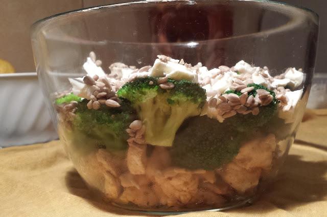 Sałatka jest warstwowa, więc układamy w dosyć wysokiej misce- najpierw ostudzonego kurczaka, na to również ostudzony brokuł, następnie ser feta. Wierzch posypujemy słonecznikiem.