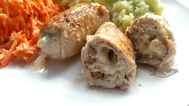 Orzechy siekamy, ale nie za drobno. W miseczce kruszymy ser i łączymy z orzechami. Na każdy kotlet nakładamy porcję sera z orzechami i zwijamy w roladkę. Wierzch również obsypujemy przyprawami. Smażymy na rozgrzanym oleju po kilka minut z każdej strony. Możecie je obtoczyć w klasycznej panierce do kotletów, ale ja wolałam zdrowszą wersję :) Podałam z surówka z marchewki i jabłka i a`la puree.