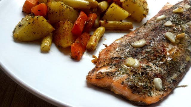 Dawno nie było żadnej rybki. W takiej wersji robię często, tylko ciągle zmieniam dodatki do ryby. A to z sałatką z dressingiem, a to z warzywami z wody. A dzisiaj z warzywami pieczonymi. :) Fajna, szybka propozycja na obiad lub kolację. Dobroć sama w sobie :)