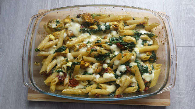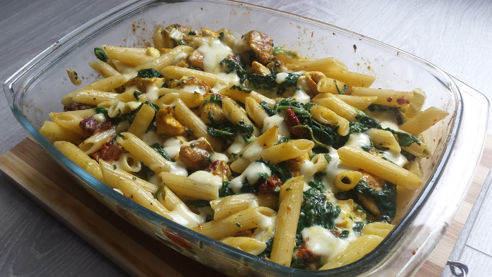 Do naczynia żaroodpornego wrzucamy makaron, dokładamy kurczaka i szpinak z pomidorami. Mieszamy. Wlewamy sos serowy i ponownie mieszamy. Na wierzch kładziemy pozostałą mozzarellę. Przykrywamy naczynie i pieczemy ok 20-25 minut w temp 200 stopni (termoobieg).
