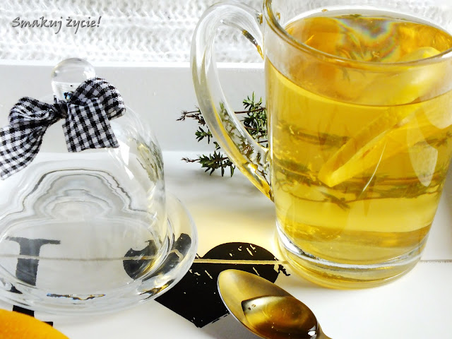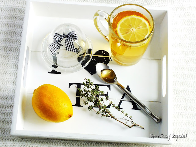 Wykonanie: Do szklanki wkładamy tymianek i zalewamy gorąca (nie wrzącą!) wodą. Przykrywamy i zaparzamy przez 5 minut. Następnie przecedzamy płyn i dodajemy resztę składników. Jeśli lubicie słodsze napoje, dodajcie więcej miodu.