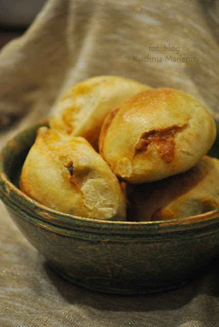 Następnie, dzielimy na mniejsze części, w zależności od tego jak duże bułeczki chcemy uzyskać, dzielimy na około 15-25 małych kuleczek- każdą następnie spłaszczamy na środek bułki nakładamy farsz i zlepiamy brzegi formując bułeczki. Wierzch smarujemy rozkłóconym jaje i dodatkowo możemy obsypać czarnuszką czy sezamem. Gotowe bułeczki wstawiamy i wstawiamy do piekarnika nagrzanego do 180 stopni na około 20-25 minut- aż będą rumiane.