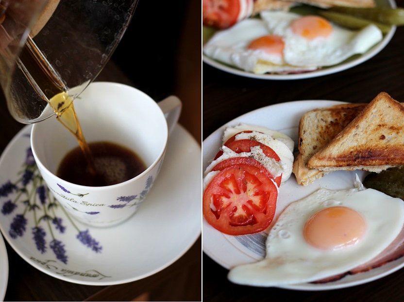 jajka sadzone na szynce, tosty z serem i ogórki kiszone.