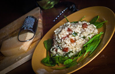 Cebulę siekamy, czosnek przeciskamy przez praskę, rozcieramy z solą. Rozgrzewamy oliwę, dusimy przez 5 minut na wolnym ogniu. Dodajemy ryż, mieszamy. Otwieramy butelkę wina, bierzemy spory łyk z butelki sprawdzając czy będzie dobre. Dodajemy wino, redukujemy. W między czasie, dla pewności próbujemy raz jeszcze. Do ryżu dodajemy porcjami bulion, czekając aż poprzednia porcja całkowicie się wchłonie. Cały czas mieszamy. Gdy ryż jest jeszcze nieco twardawy, dodajemy szpinak oraz pomidory. Dodajemy kolejną porcję bulionu, sprawdzamy czy ryż jest gotowy (al dente). Doprawiamy solą, pieprzem. Gotowe risotto ściągamy z ognia, dodajemy parmezan oraz masło, przykrywamy i odstawiamy na 2 minuty. Porządnym łykiem z butelki sprawdzamy temperaturę wina. Białe powinno być przecież schłodzone. Risotto wykładamy na talerze a resztę wina wlewamy do kieliszka naszej drugiej połówce. Smacznego !