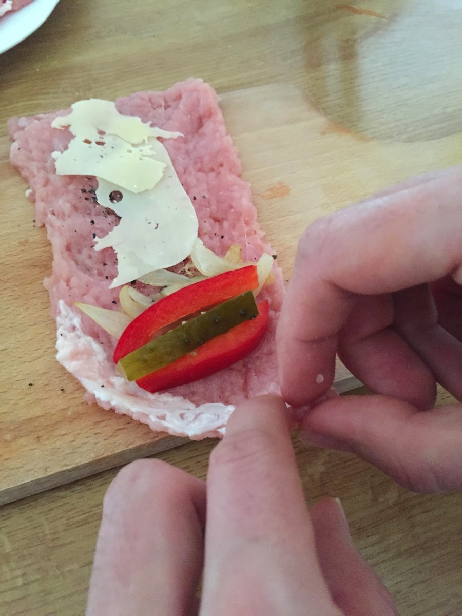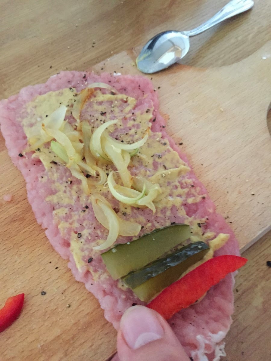 W pierwszej wersji kładziemy cebulkę, serek ,żółty, ogórka oraz paprykę.