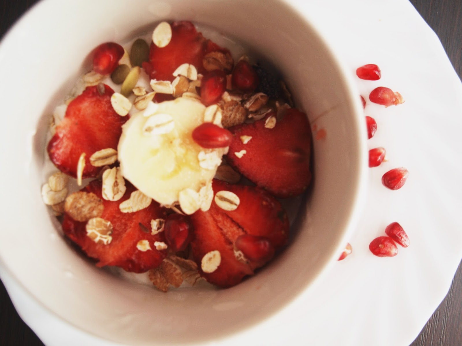 Za każdym razem, kiedy cofnę się kilka lat wstecz i przypomnę sobie, że nienawidziłem śniadań, to mam ochotę strzelić sobie porządnego liścia w twarz. Mam nadzieję, że wszyscy jesteście świadomi tego, że to właśnie śniadanie jest najważniejsze. Celebrujcie tę chwilę, bo warto. Proponuję chociażby jogurt naturalny z musli, truskawką, bananem i granatem.