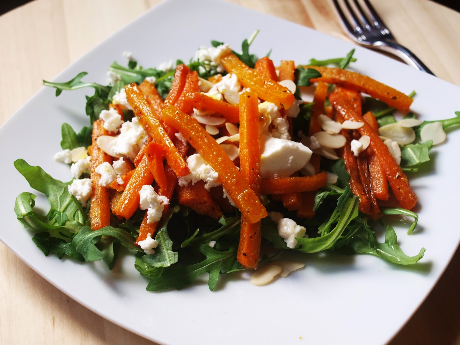 Upieczone marchewki wyłóżcie na sporej ilości rukoli. Następnie dodajcie migdały i pokruszcie fetę. Kiedy już wiem, że pieczona marchew jest dobrym sposobem na przystawkę i kolację, będę częściej ją wykorzystywał do moich dań.