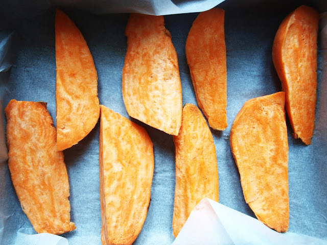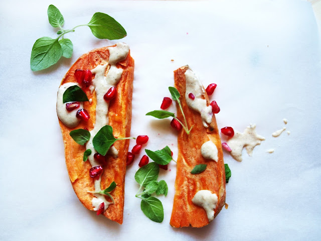 Czasami mam taki okres, że jadam okropnie i łapię wszystko, co mam pod ręką. Szczególnie, kiedy jestem w domu rodzinnym i lodówka zawsze jest pełna. Obiady zazwyczaj są gotowe, a ja jedyne na co mam ochotę, to beztroskie lenistwo. Bataty to smaczny kąsek dla tych, którzy przepadają za marchewką i jej słodkawym smakiem. Ja batata zapiekłem i podałem z sosem tahini, granatem i świeżym oregano.