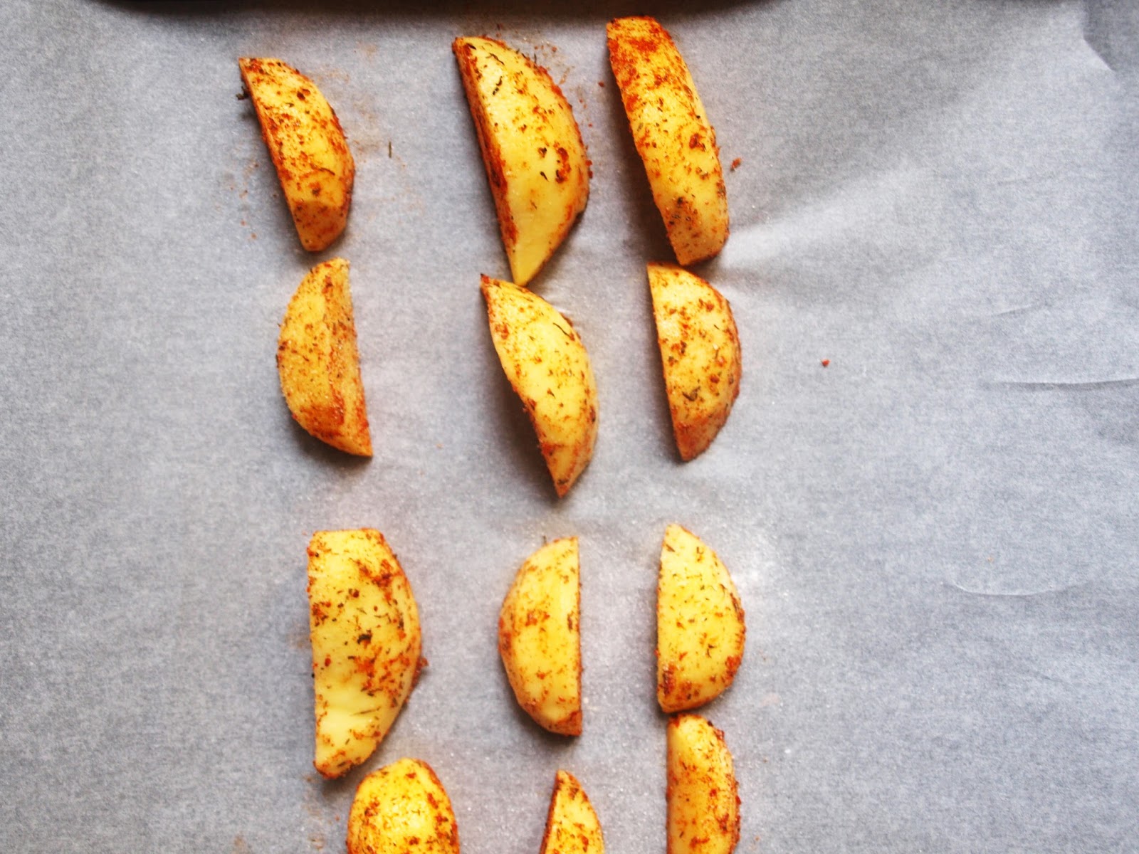 Musicie obrać ziemniaki, umyć i pokroić w łódeczki. Gotowe łódeczki obtoczcie w czubrycy czerwonej (jeśli nie wiecie co to czubryca, kliknijcie TUTAJ), które według mnie idealnie nadają się do pieczonych ziemniaków. Na sam koniec skropcie delikatnie ziemniaki oliwą i odrobinkę posólcie. Ja ustawiłem piekarnik na 200 stopni i piekłem ziemniaczki 40 minut. Podawajcie z ulubionym sosem, bo pieczone ziemniaki są suche i bez sosu mogą być mniej atrakcyjne w smaku. Możecie też łódeczki wsadzić na głęboki olej i uczynić z nich niezdrową przekąskę. Ja zdecydowanie wolę piekarnik. Student też potrafi gotować