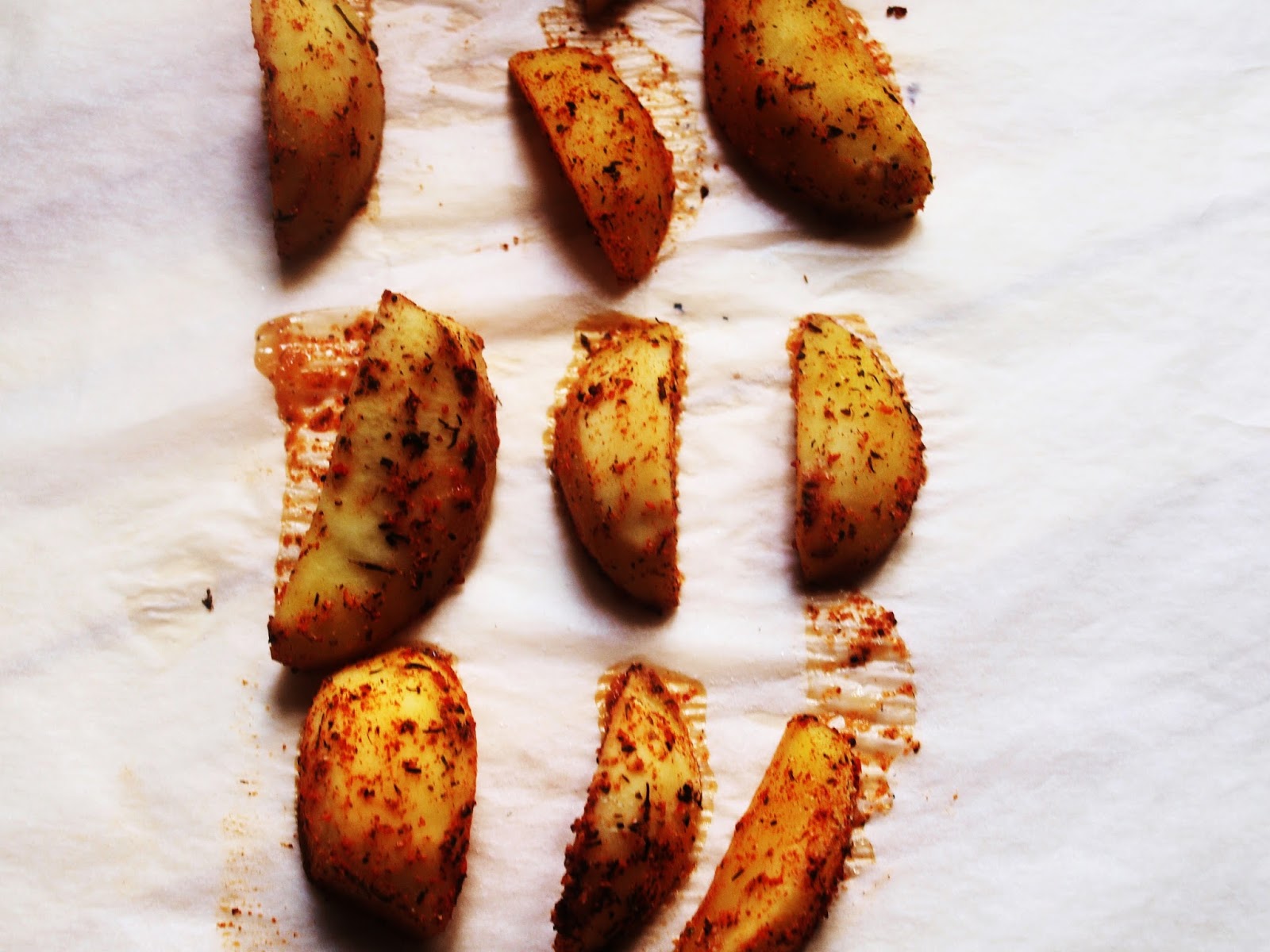Musicie obrać ziemniaki, umyć i pokroić w łódeczki. Gotowe łódeczki obtoczcie w czubrycy czerwonej (jeśli nie wiecie co to czubryca, kliknijcie TUTAJ), które według mnie idealnie nadają się do pieczonych ziemniaków. Na sam koniec skropcie delikatnie ziemniaki oliwą i odrobinkę posólcie. Ja ustawiłem piekarnik na 200 stopni i piekłem ziemniaczki 40 minut. Podawajcie z ulubionym sosem, bo pieczone ziemniaki są suche i bez sosu mogą być mniej atrakcyjne w smaku. Możecie też łódeczki wsadzić na głęboki olej i uczynić z nich niezdrową przekąskę. Ja zdecydowanie wolę piekarnik. Student też potrafi gotować