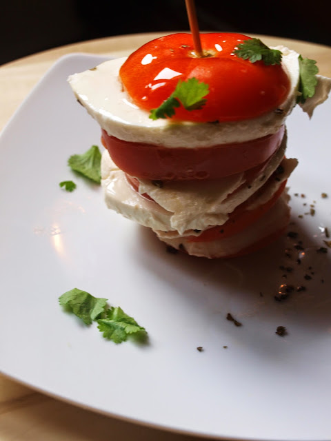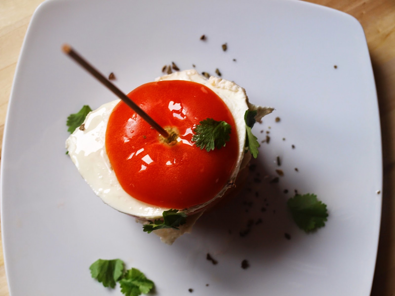 Tutaj nie ma żadnej filozofii. Sytuacja jest banalnie prosta. Potrzebny jest Wam pomidor i kulka mozzarelli. W zależności ile chcecie pomidorów przygotować, tyle ich bierzecie. Mogę tylko nadmienić, że na jednego dużego pomidora zużywam jedną kulkę mozzarelli. Pomidora musicie pokroić w plastry. Między każdą warstwę dodajcie mozzarellę przyprawioną bazylią. Kiedy będziecie mieć już piętrowego burgera, przebijcie go patyczkiem. Na sam koniec dodałem też liście świeżej kolendry i oliwę z oliwek. Szybka i smaczna przystawka gotowa.