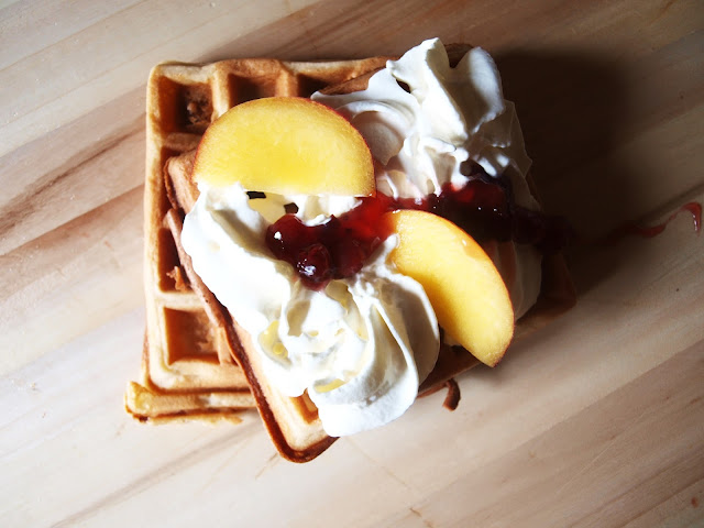 Jeżeli chodzi o składniki na gofra, to ja zrobiłem takiego, jak najbardziej lubię. Mnóstwo bitej śmietany, brzoskwinia i trochę żurawiny.