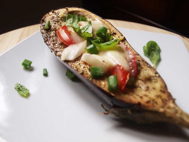 Zarówno bakłażana, jak i cukinię musicie przekroić na pół i wydrążyć środek. Osólcie i odstawcie na 10 minut. W międzyczasie pokrójcie pomidory, cebulę i szczypiorek. Osolonego bakłażana i cukinię umyjcie i przyprawcie ziołami prowansalskimi, oregano, pieprzem oraz suszoną natką pietruszki. Do każdego z warzyw włóżcie pomidory z cebulą i na sam koniec mozzarellę. Rozgrzejcie piekarnik na 180 stopni i pieczcie przez około 20 minut. Bakłażan u mnie potrzebował trochę więcej czasu, bo był większy i grubszy.