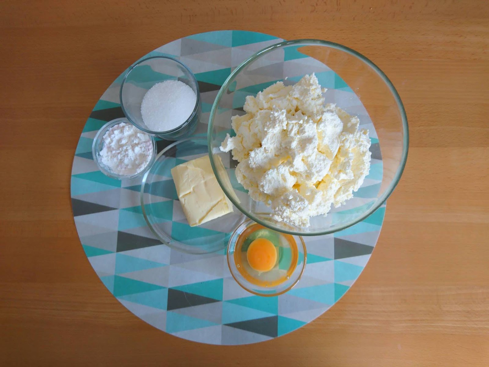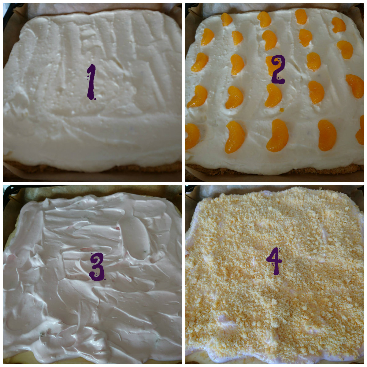 1. masa serowa 2. mandarynki 3. różowa pianka 4. reszta kruchego ciasta |