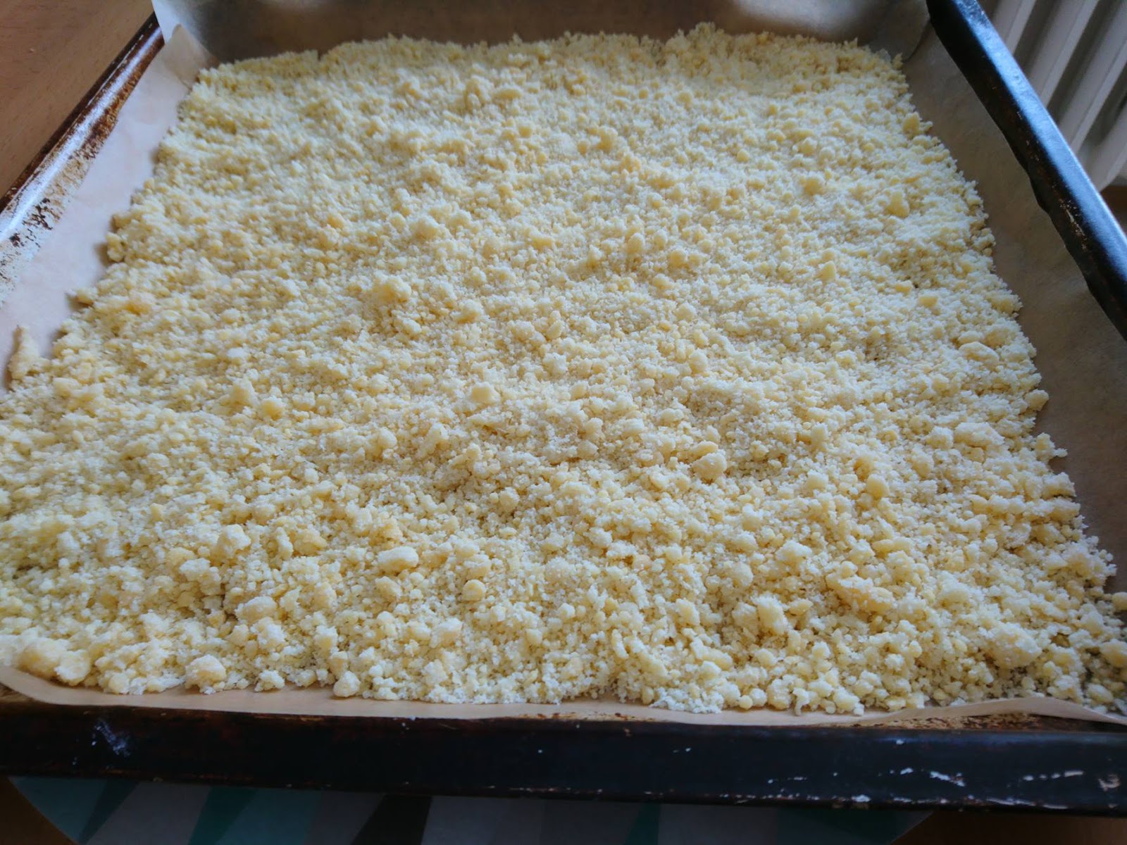 Przygotowanie ciasta zaczynamy od kruchego spodu. Piekarnik nagrzać do 180 stopni. Margarynę roztopić w rondelku na małym ogniu. Odstawić do ostudzenia. Do miski przesiać mąkę, dodać cukier i proszek do pieczenia. Dokładnie wymieszać. Do mąki dodać żółtka i roztopiony tłuszcz. Wszystko wymieszać mikserem. Następnie przełożyć 2/3 ciasta na blachę wyłożoną papierem do pieczenia i włożyć do piekarnika na ok. 7-8 minut, aż spód się lekko podpiecze.
