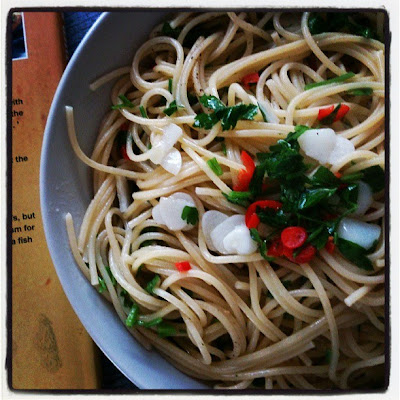 jak makaron będzie gotowy, rozgrzej dużą patelnię, wlej na nią 2 łyżki oleju, dorzuć czosnek i chilli