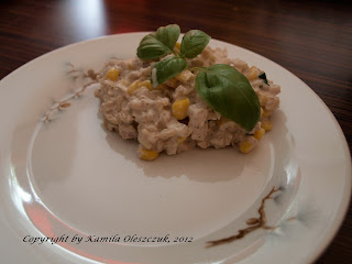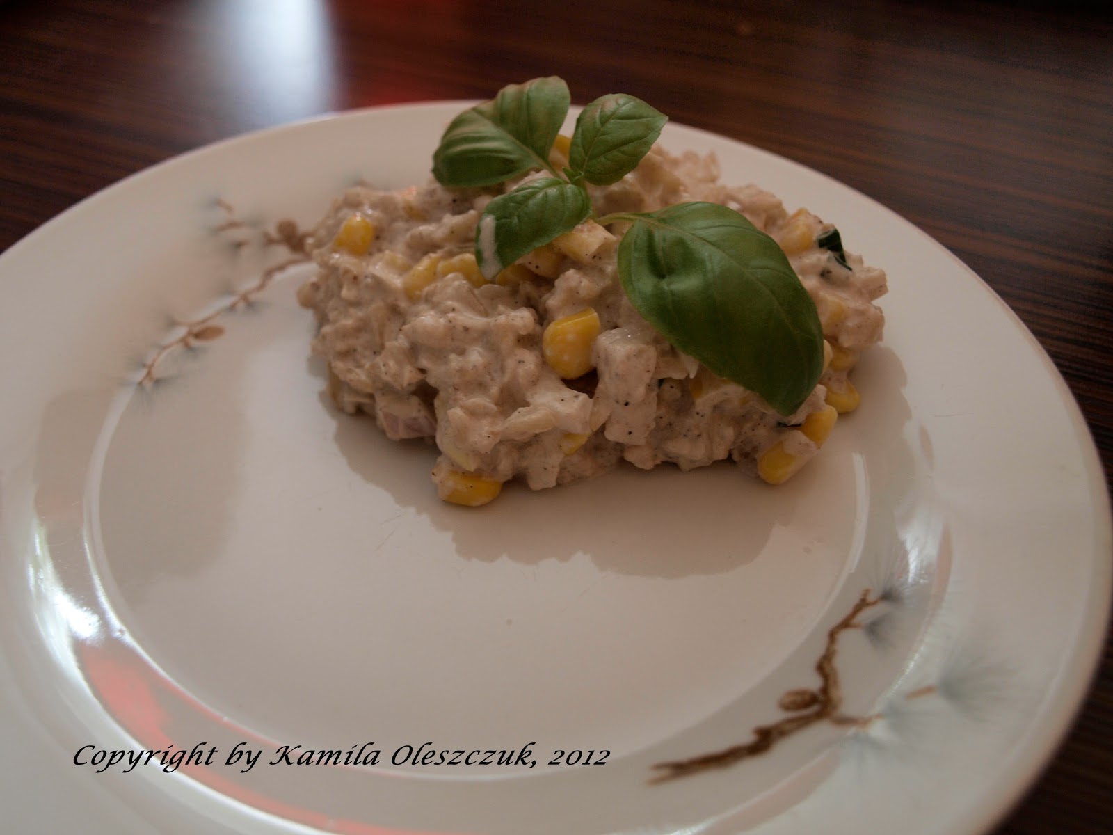 Ryż należy ugotować zgodnie z instrukcją na opakowaniu. W salaterce łączymy pokrojoną w kostkę cebulę, odsączone tuńczyka i kukurydzę. Dodajemy ugotowany ryż, skrapiamy składniki sokiem z cytryny, doprawiamy przyprawami. Majonez rozrabiamy z jogurtem – proporcje wg własnych upodobań. Dodajemy sos do salaterki i mieszamy delikatnie.