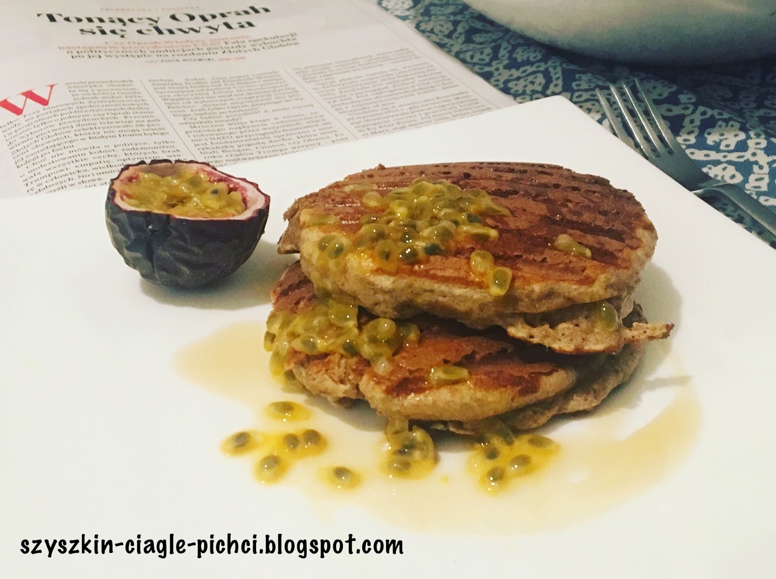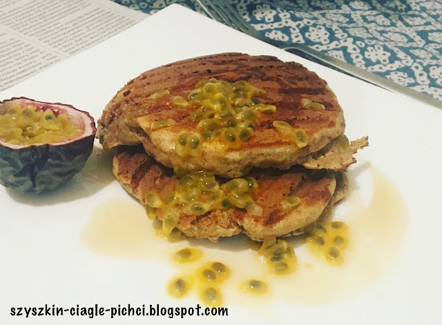 Ja moje pancakes podałam z odrobiną syropu klonowego (ach, witaj amerykańska tradycjo!) i dla zrównoważenia smaku, z owocem marakui, ostatnio moim ulubionym. Możecie jednak podać je z czym tylko chcecie, z dżemem, owocami, a nawet cukrem pudrem. A ponieważ przygotowałam je bez cukru, możecie "niesłodką" część rodziny poczęstować tymi samymi placuszkami, z bekonem albo jajkiem sadzonym. Albo i z tym, i z tym! :)
