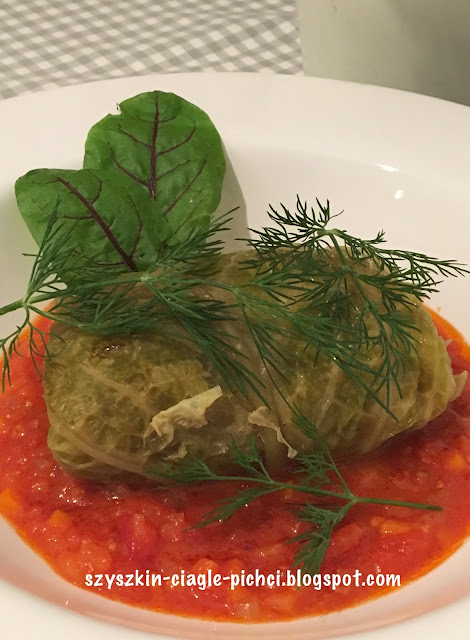 Gołąbki podajemy na gorąco z sosem pomidorowym.