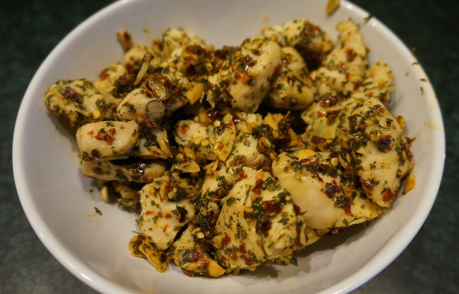 Kurczaka kroimy w grubą kostkę, przyprawiamy tak, jak lubimy najbardziej (ja na ostro) i smażymy.