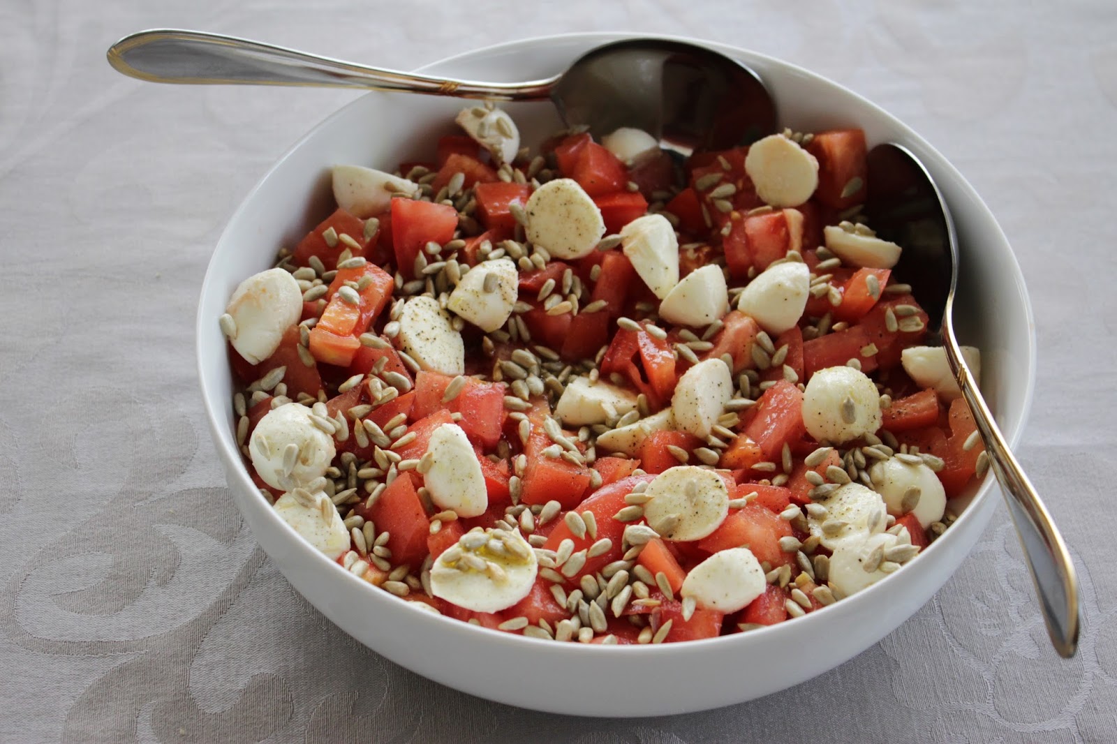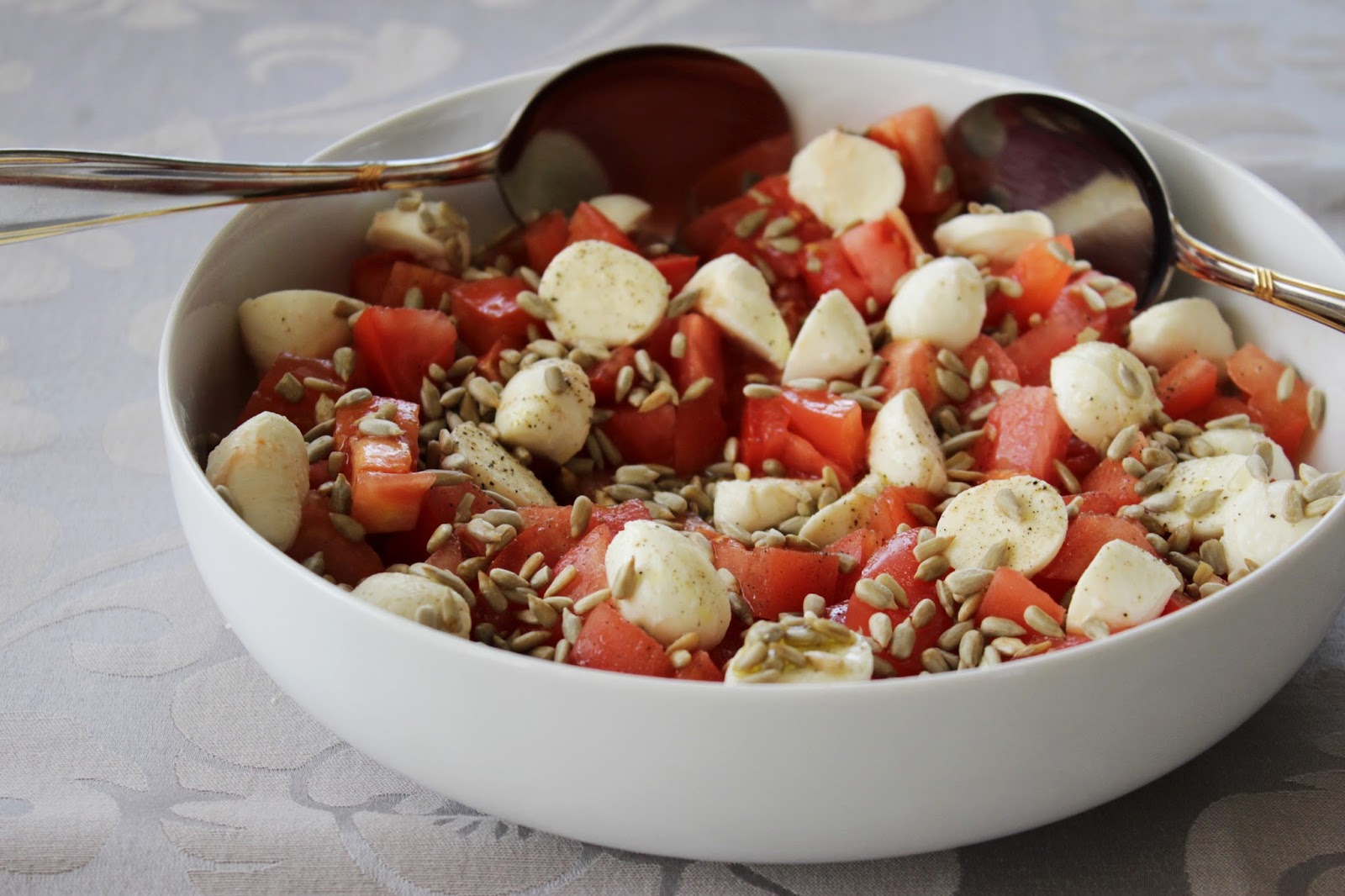 W misce poukładać pomidory, mozzarellę, polać przygotowanym sosem, a na koniec posypać słonecznikiem.