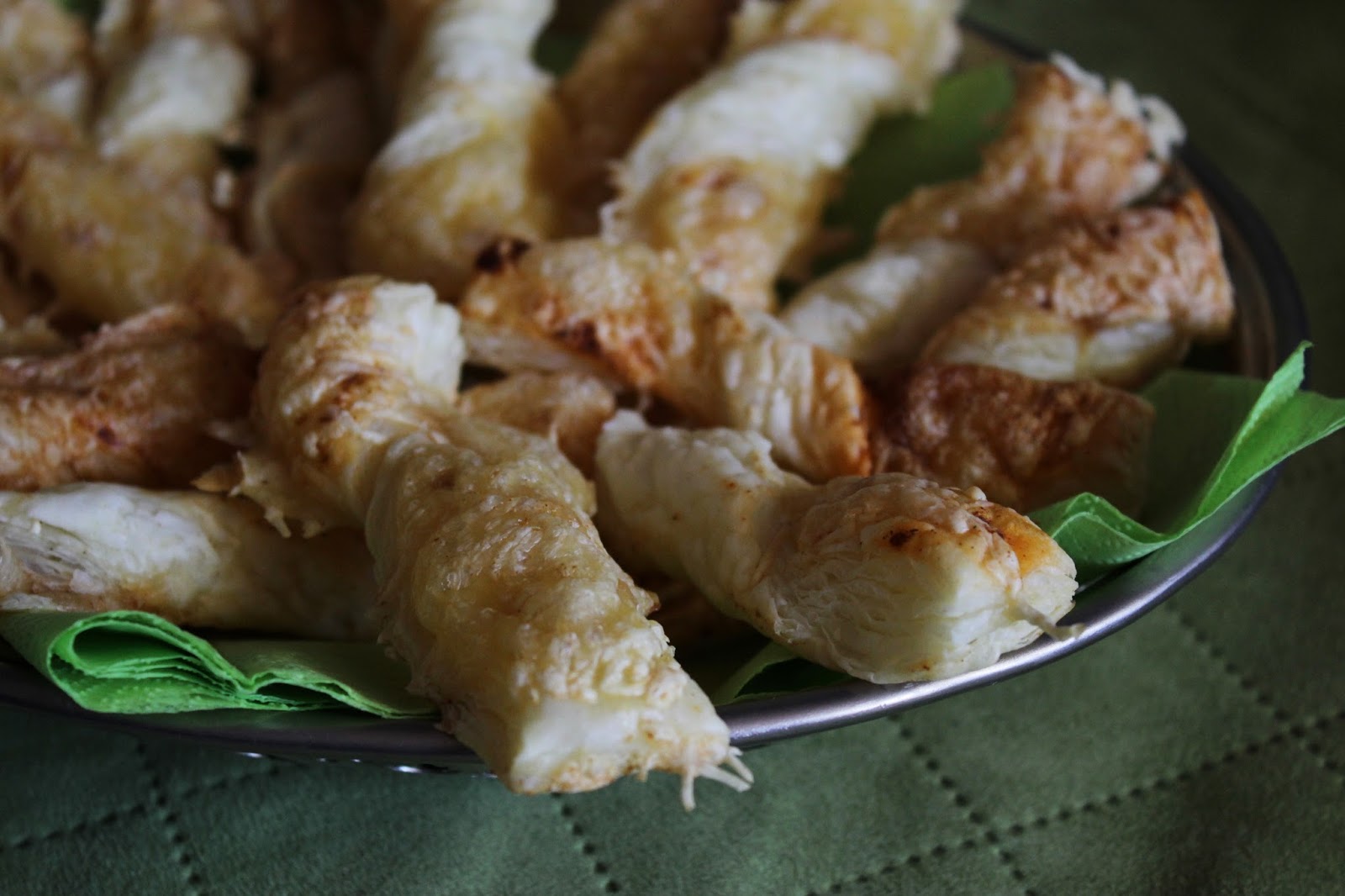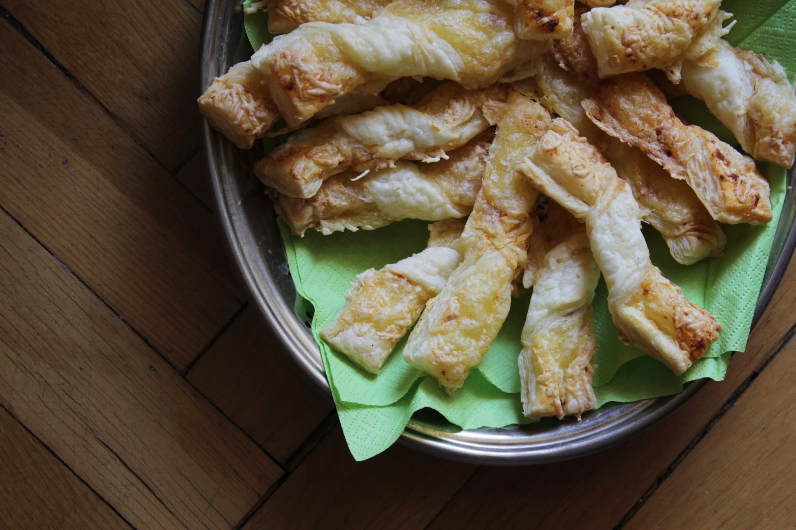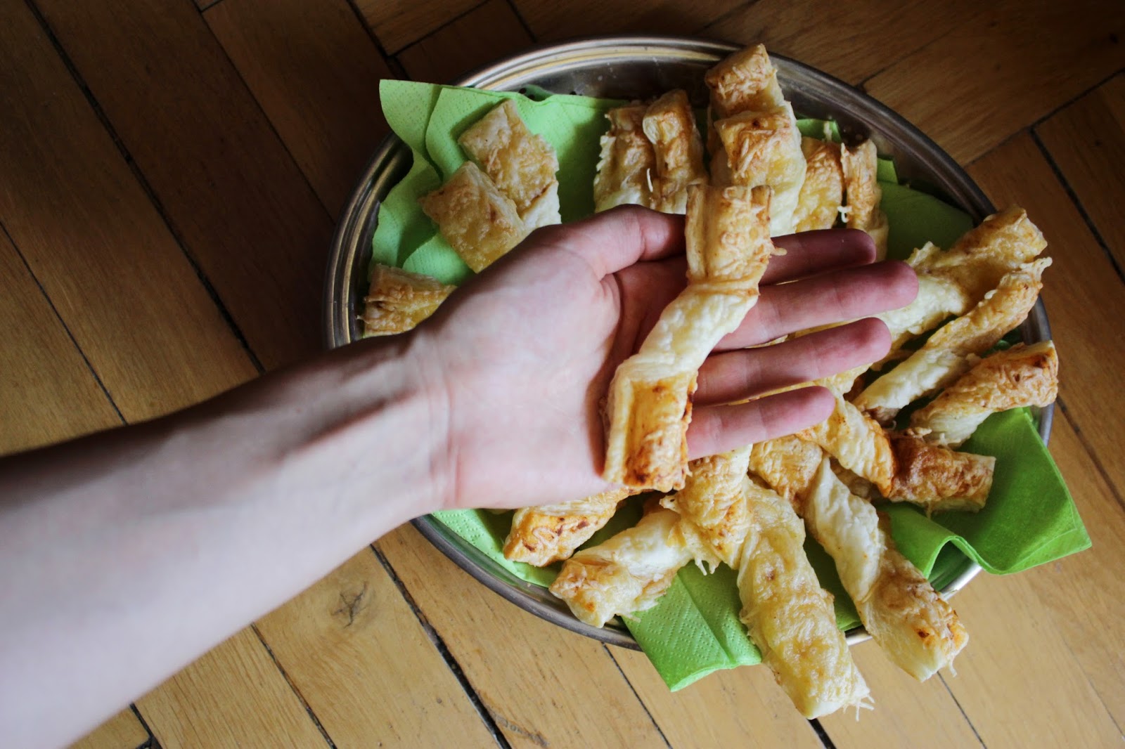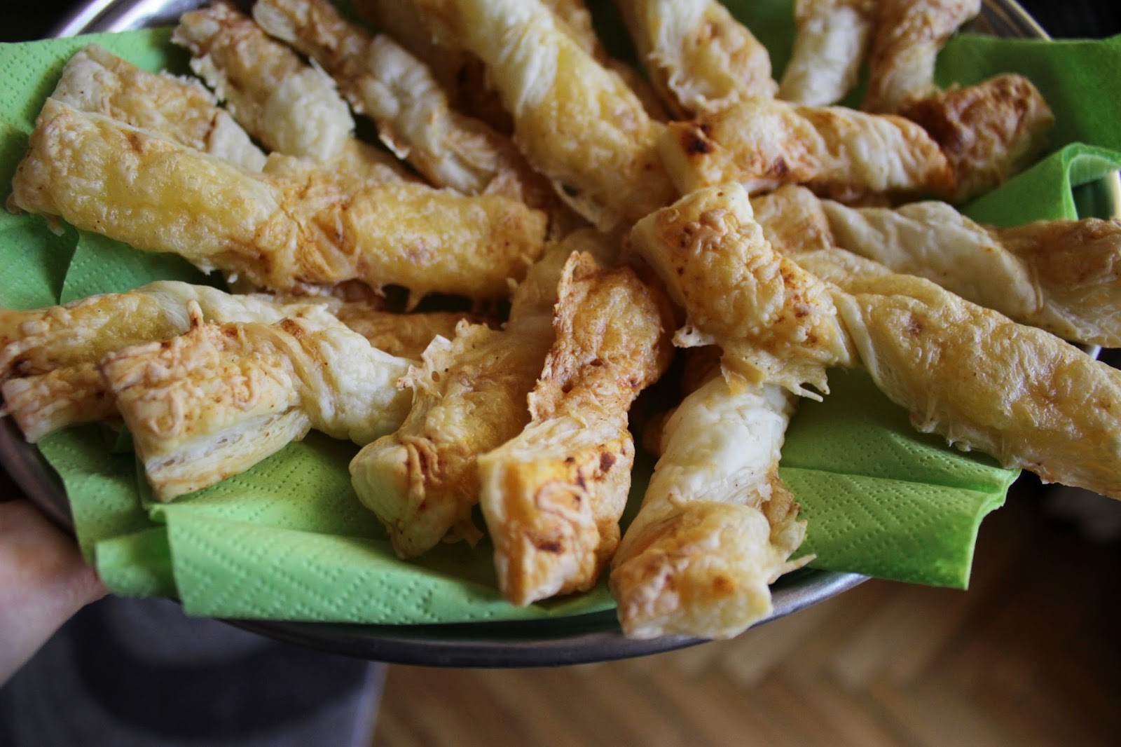 Ciasto francuskie rozwinąć na blacie i pokroić nożem najpierw wzdłuż na pół, a następnie kroić w poprzek na paseczki o szerokości około 2 cm.