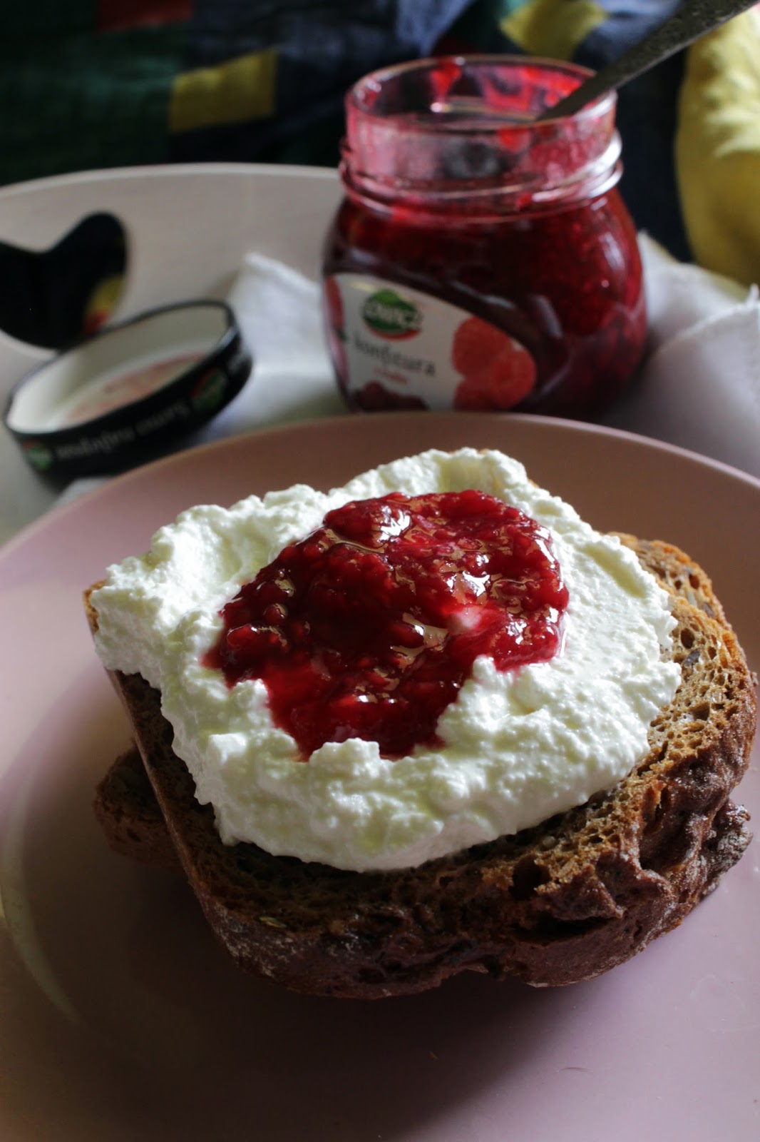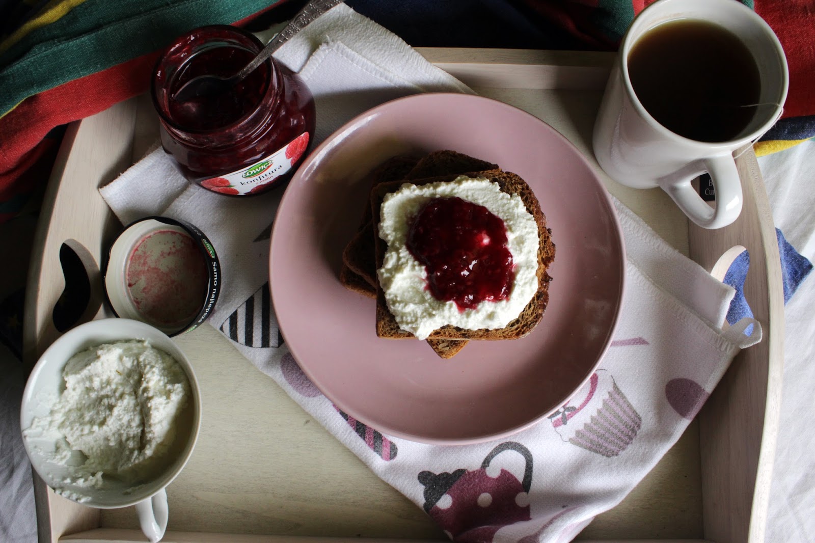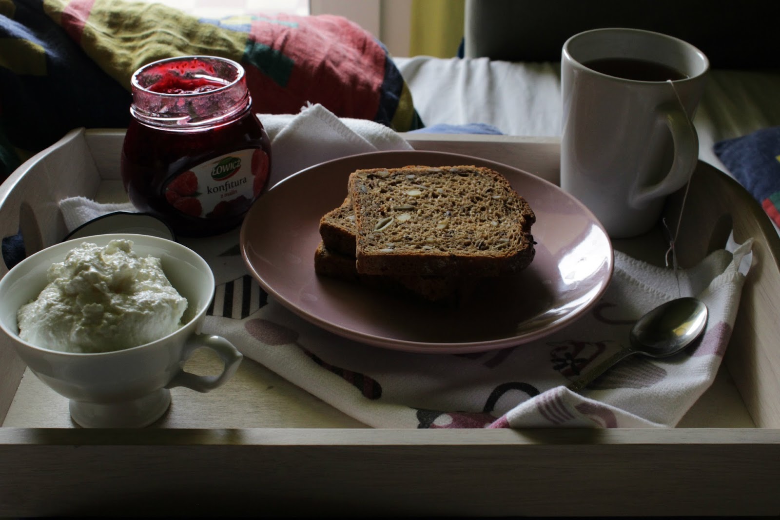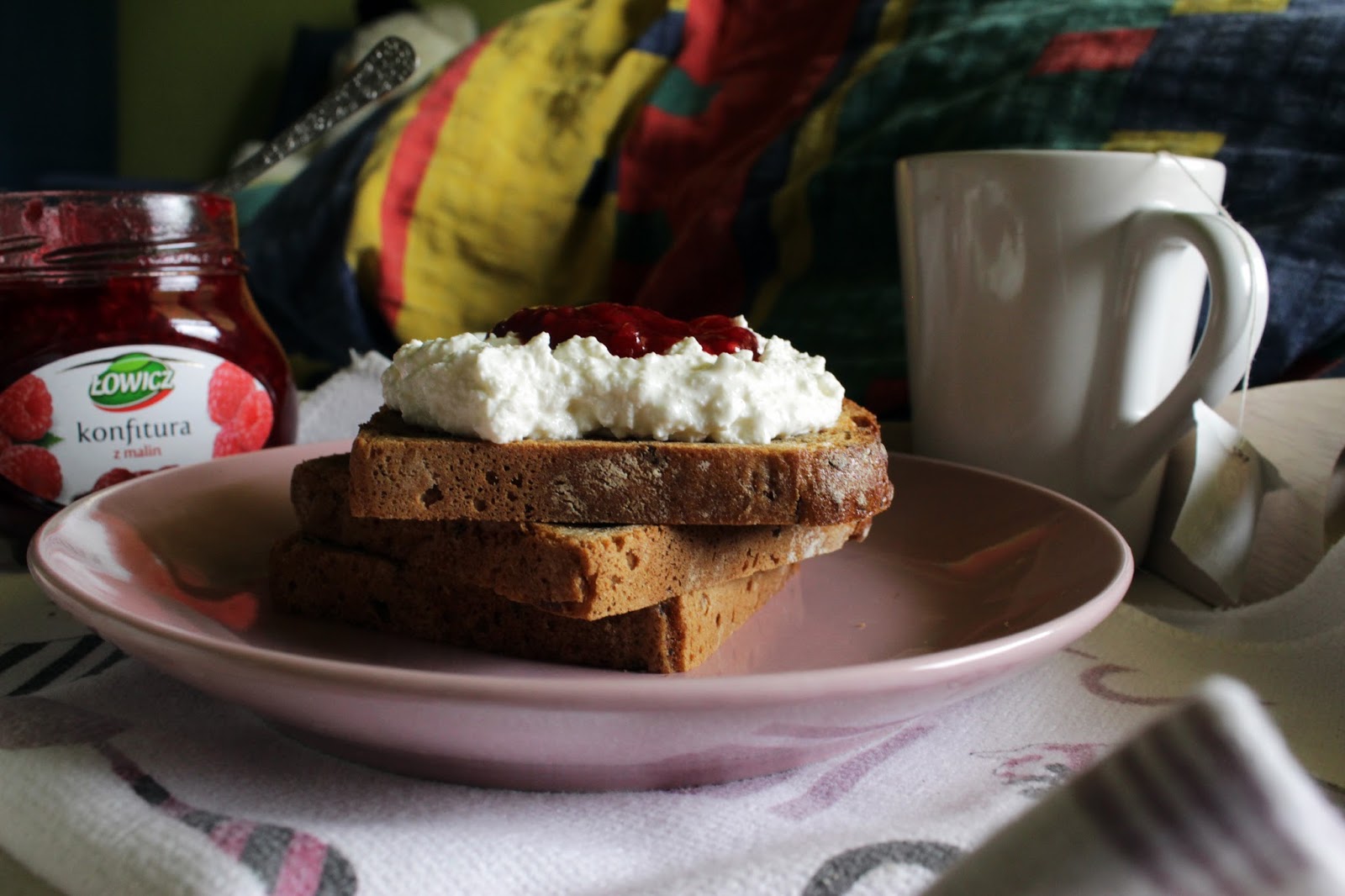 Pełnoziarnisty chleb z twarożkiem i konfiturą malinową, herbata o smaku czarnej porzeczki