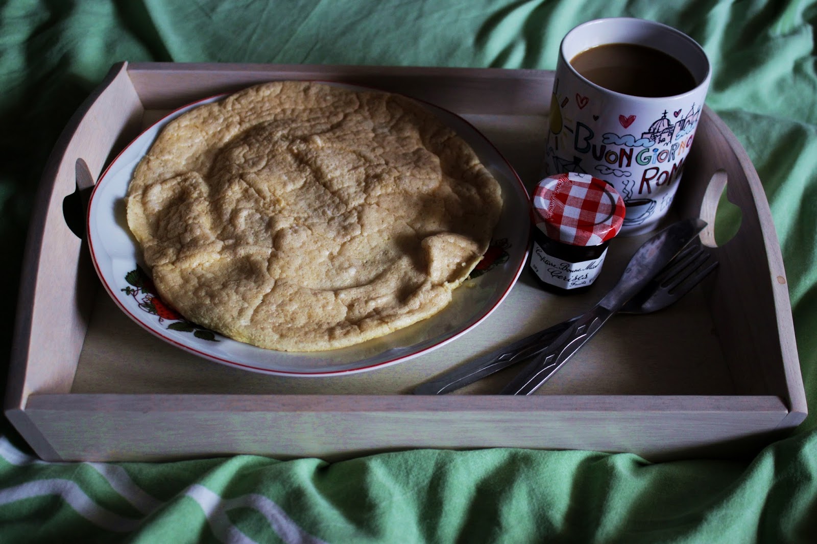 Omlet biszkoptowy z wiśniową konfiturą i kawa z mlekiem