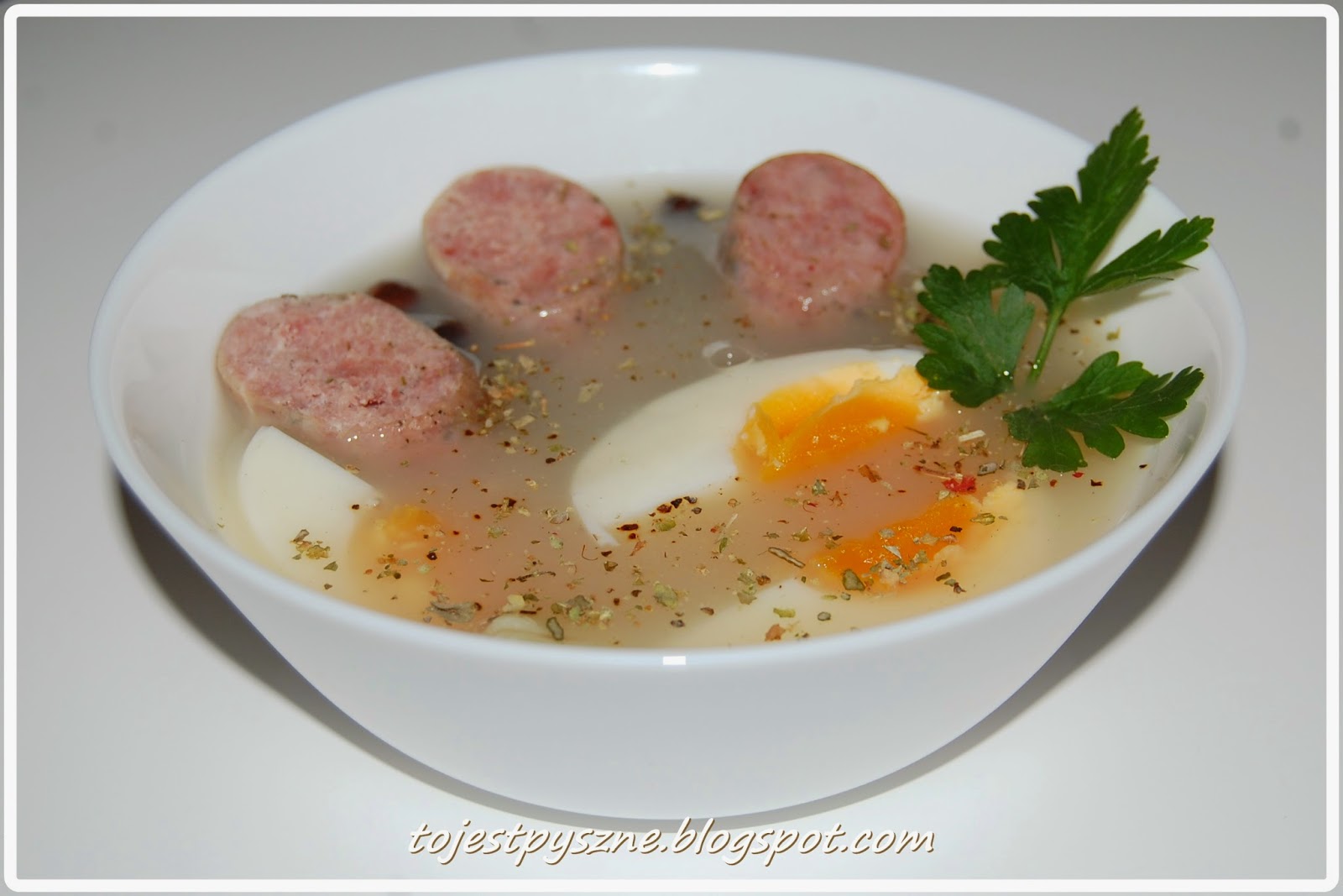 1 litr wody zagotować. Zmniejszamy gaz i dopiero po chwili wrzucamy kiełbasę. Gotujemy ok. 25-30 minut, nie doprowadzając do wrzenia (temp. wody ok. 80 st.C). Podczas parzenia dodajemy ok. 2 płaskich łyżeczek soli, ziele angielskie, pieprz, liście laurowe, cebulę w całości i czosnek.Po tym czasie wyciągamy kiełbasę, zaś garnek zdejmujemy z ognia. Wlewamy barszcz i mieszamy. Doprawiamy solą, pieprzem i majerankiem wedle uznania. Gotujemy jeszcze chwilę, nie doprowadzając do wrzenia. Podajemy z jajkiem na twardo i kawałkami parzonej kiełbasy. Smacznego
