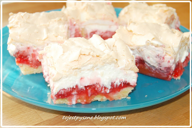 Czas na przygotowanie bezy. Białka ubijamy, dodajemy sok z cytryny i partiami cukier. Ubijamy tak długa, aż piana będzie gęsta i sztywna. Na koniec dodajemy mąkę ziemniaczaną i dokładnie mieszamy. Pianę wykładamy na blachę wyłożoną papierem do pieczenia. Lekko falujemy. Pieczemy w temp. 160st.C przez 30 minut. Po tym czasie studzimy przy lekko uchylonych drzwiczkach piekarnika. w tym czasie ciasto z truskawkami studzimy.