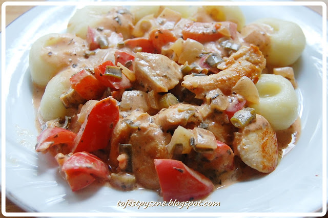Pierś z kurczaka kroimy w dużą kostkę. Posypujemy przyprawą do kurczaka lub korzystamy z takich przypraw, które lubimy najbardziej. Odstawiamy na kilka minut. W tym czasie robimy sos. Cebulę, czosnek i paprykę kroimy w kostkę. Podsmażamy kilka minut na łyżce smalcu. Zalewamy odrobiną wody. Doprawiamy solą. Dodajemy ziele angielskie, liść laurowy i szczypiorek. Dusimy przez kilka minut. W tym czasie do śmietany dodajemy przecier pomidorowy, zioła prowansalskie, gałkę muszkatołową i dokładnie mieszamy. Doprawiamy solą i cukrem. Dodajemy do warzyw i mieszamy. Czekamy, aż zawrze. Pierś z kurczaka obsmażamy. Gotową polewamy sosem. Można podać z makaronem, ziemniakami lub wedle uznania. smacznego.