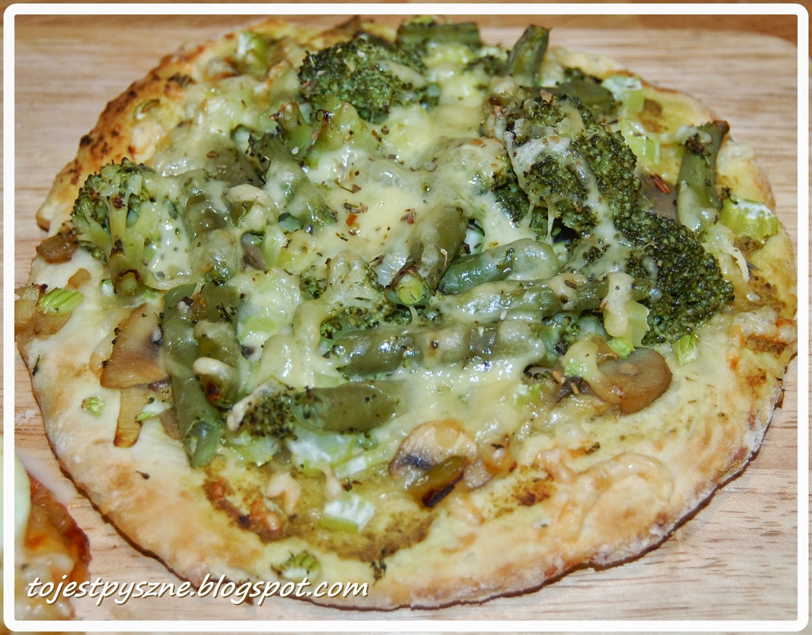 pesto, pieczarki z cebulą, brokuł, fasolka szparagowa, seler naciowy (pokrojony w kostkę), ser żółty (tarty), oreganoSpód smarujemy pesto.
