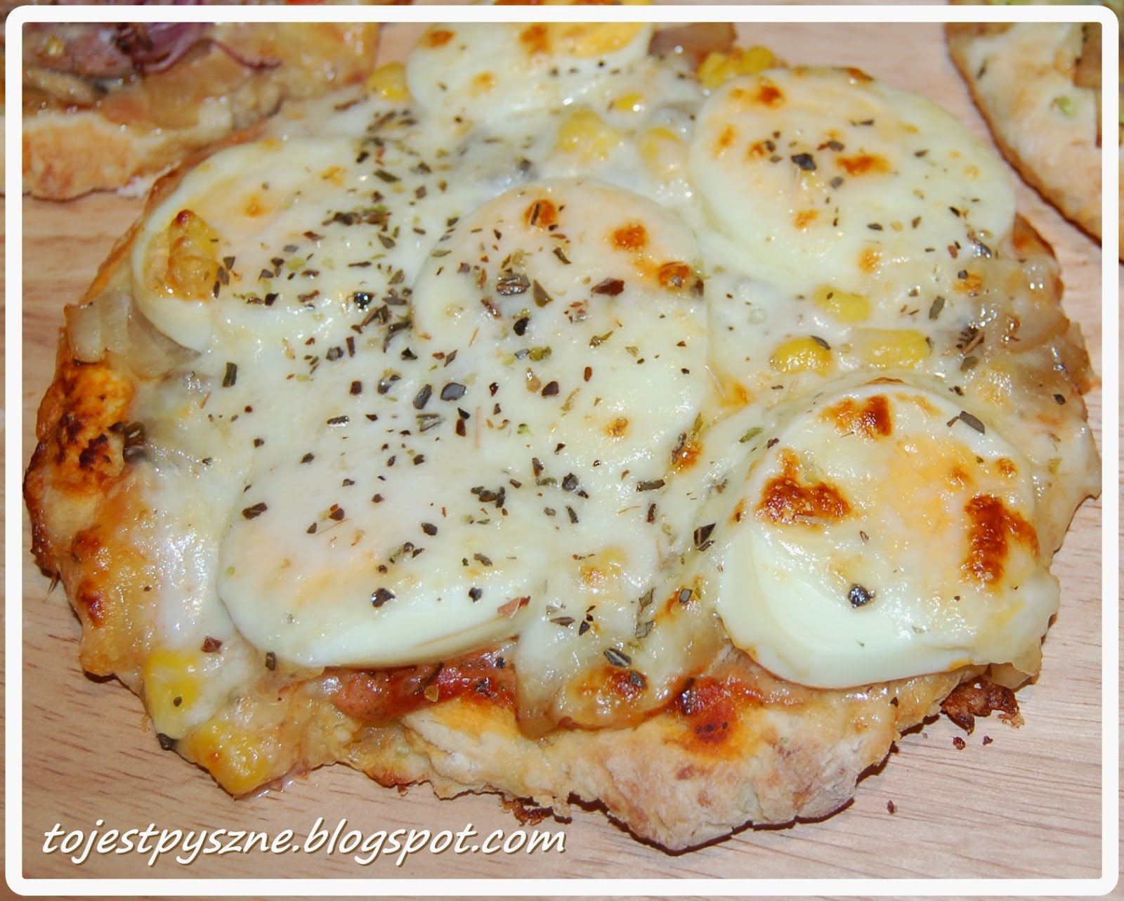 Dodatki: pieczarki z cebulą obsmażone, ser żółty, ugotowane na twardo jajko pokrojone w plastry, kukurydza konserwowa, oregano