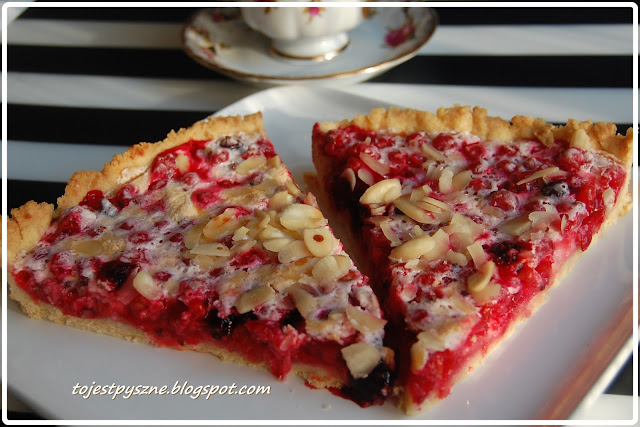 Tartę z owocami piekłam już wielokrotnie. Wersja pierwotna była z wiśniami. Tym razem postanowiła upiec tartę z porzeczkami. Z góry uprzedzam, że tarta ta jest smaczna, jednak z porzeczkami dość kwaśna, więc do piany można dodać więcej cukru, jak w przepisie, który teraz podam.