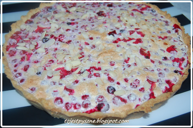 Tartę z owocami piekłam już wielokrotnie. Wersja pierwotna była z wiśniami. Tym razem postanowiła upiec tartę z porzeczkami. Z góry uprzedzam, że tarta ta jest smaczna, jednak z porzeczkami dość kwaśna, więc do piany można dodać więcej cukru, jak w przepisie, który teraz podam.