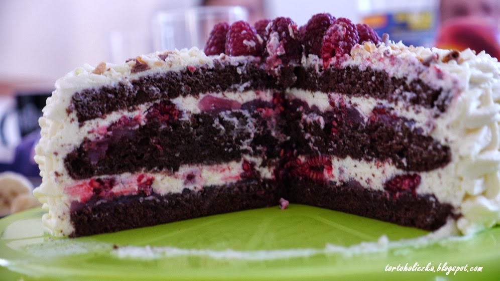 W tym przypadku wykorzystałam przepis na TEGO torta, z tym, że wiśnie zamieniłam na maliny i całkowicie pominęłam dodatek alkoholu do ponczu, a zamiast czekoladowego ciasta wykorzystałam sprawdzony już przepis na biszkopt kakaowy. Na upartego możnaby spróbować zrobić tort z mrożonych malin (pomijając ich użycie do dekoracji oczywiście), ale przyznam szczerze - nie mam pojęcia jak się one (w tej postaci w całości) zachowają w masie. Z pewnością sprawdzą się w przygotowaniu malinowej masy, którą przekładamy biszkopty nim nałożymy na nie krem śmietankowy.