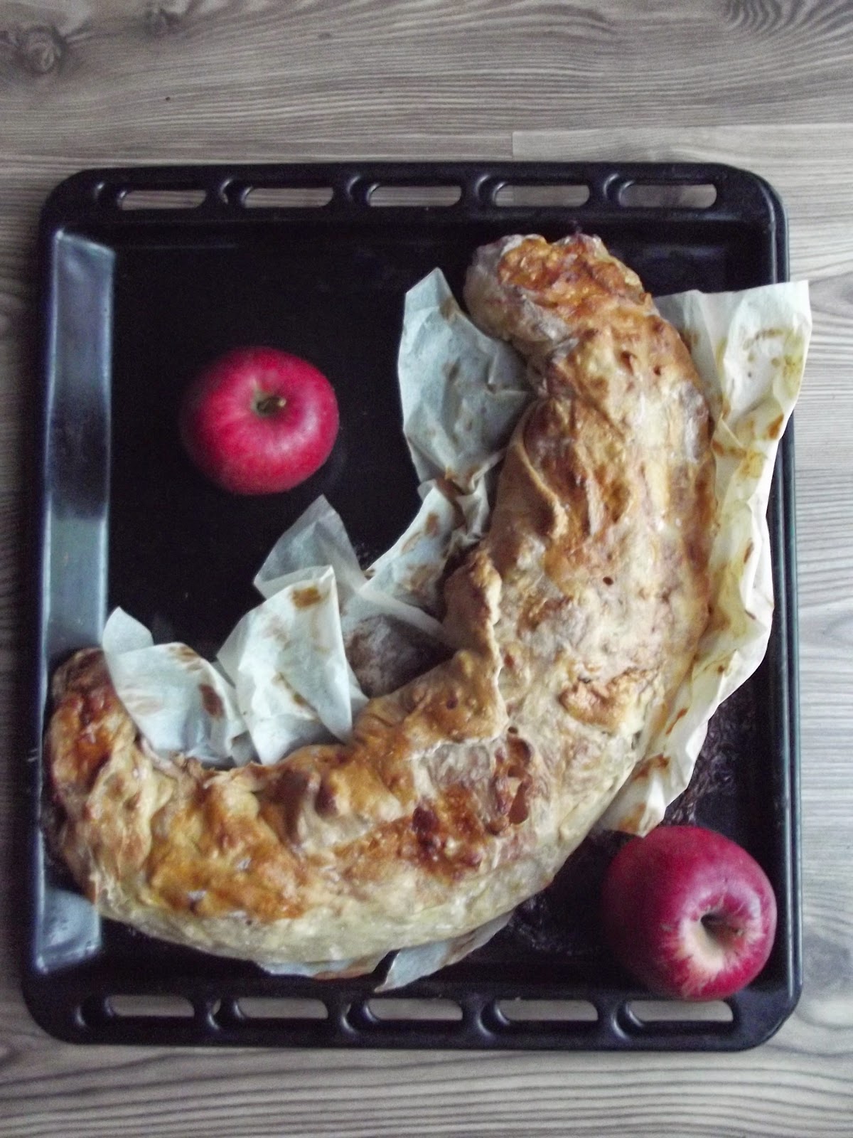 Szybko zagnieść ciasto z podanych składników i odłożyć na 30 min, by odpoczęło. W tym czasie obrać jabłka i pokrojone wymieszać z kaszą i cynamonem ( można dodać cukier). Gdy ciasto odpocznie zacząć je wałkować, a później delikatnie rozciągać dłońmi ( na obrusie/ściereczce), tak by przebijały przez nie promienie światła. Wzdłuż dłuższego boku ciasta wyłożyć jabłka i przy pomocy ściereczki, na której ciasto było rozłożone delikatnie zawijać strudel uważając, by nie przerwać ciasta. Piec w temperaturze 180* z termoobiegiem, aż do zarumienia powierzchni. Mleko podgrzać z rozkrojoną laską wanilii i cukrem, żółtka ubić z mąką ziemniaczaną, gdy mleko zacznie się gotować dolać odrobinę do żółtek ( by je zahartować), później wymieszać resztę mleka z żółtkami i ponownie wlać do garnka podgrzewając do zgęstnienia ( ma pozostać płynny, ale gęstszy niż mleko). Ciasto podawać z sosem jeszcze ciepłe.