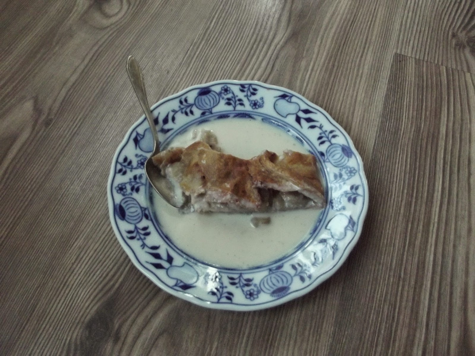 Lecz świadoma tego, że czasami potrzeb więcej ciepła niż chłodu, piekę spokojnie ciasto z jabłkami, niezwykłe, wypełnione owocami z chrupką skorupką, zanurzone w kremowym sosie.